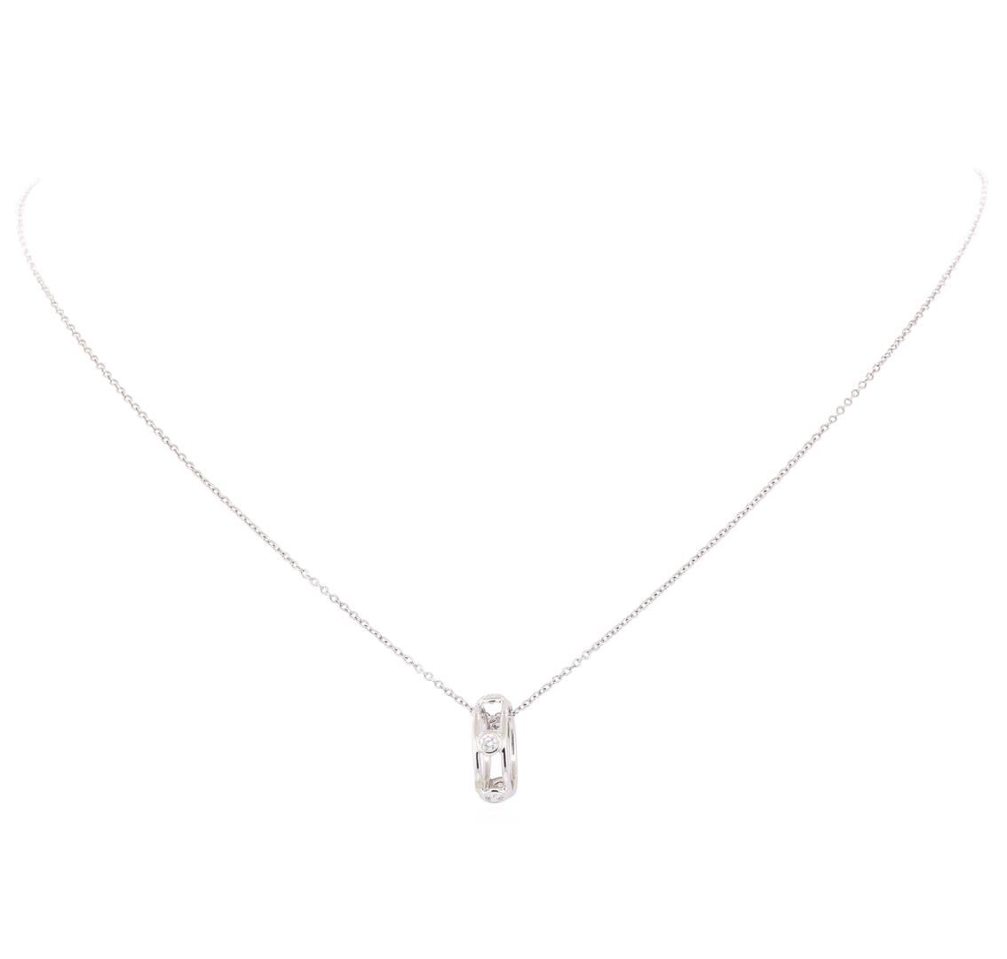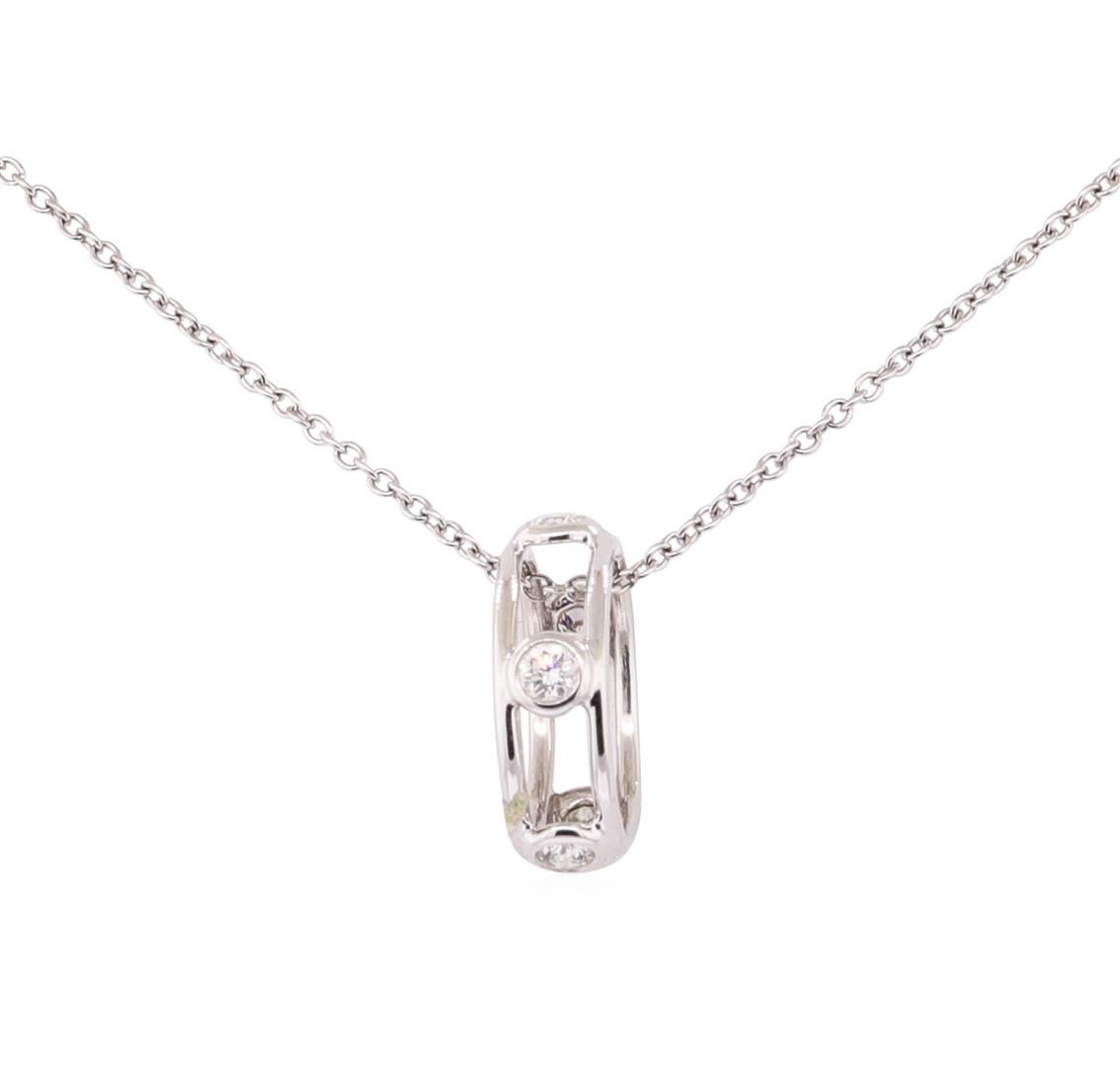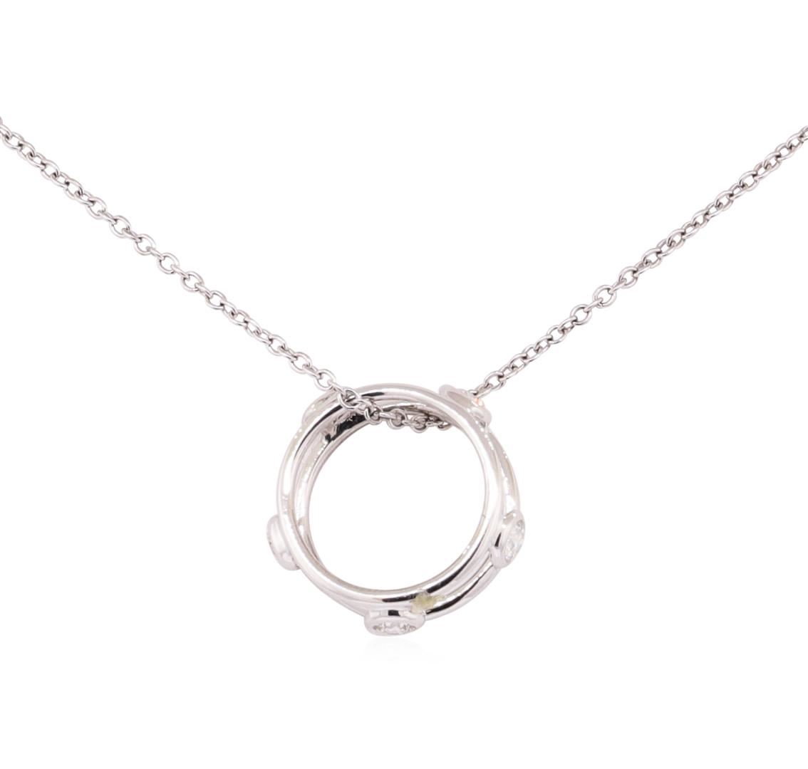 One Tiffany and Company Elsa Peretti Ring Pendant with Chain featuring: 18KT white gold weighing 2.7 grams containing diamonds weighing 0.25ctw. The ring pendant is attached to a sixteen inch long, 1mm oval cable link chain.