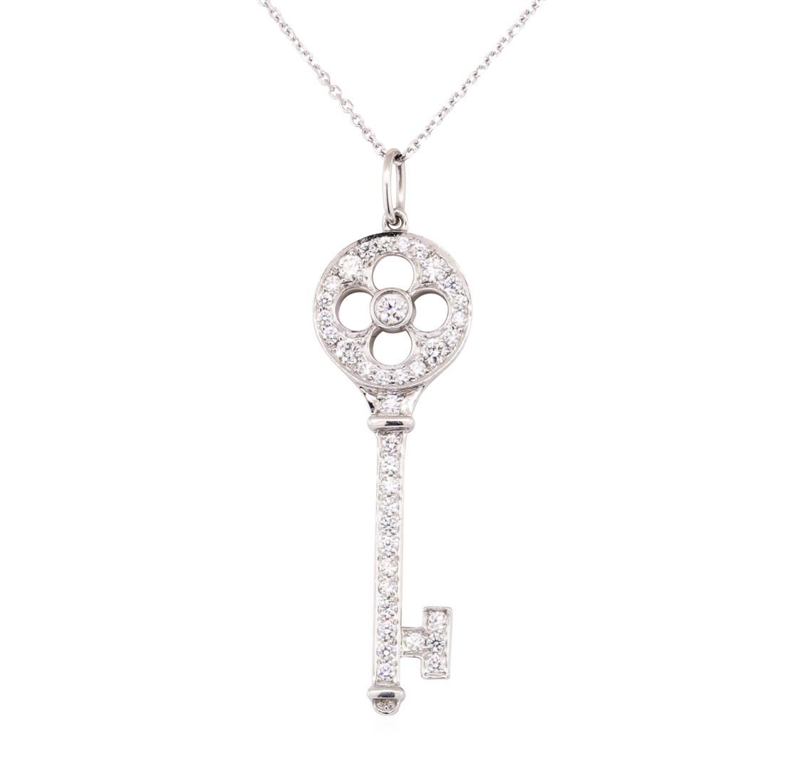 One Tiffany and Company Key Pendant and Chain featuring: a key pendant cast in platinum attached to a sixteen inch long 1mm diamond cut cable link chain cast in 14KT white gold, weighing a total of 4.7 grams. The pendant containing diamonds weighing 0.41ctw.