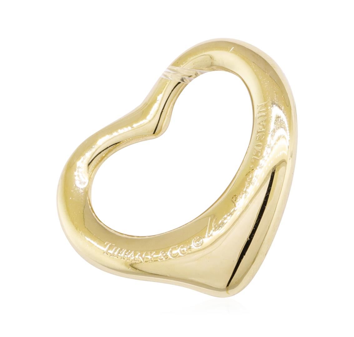 One Tiffany and Company Elsa Peretti Open Heart pendant featuring: 18KT yellow gold weighing 2.4 grams.