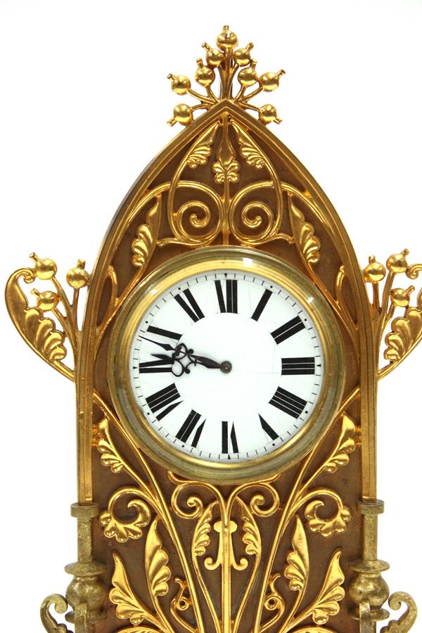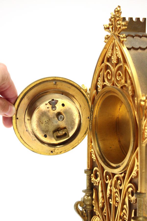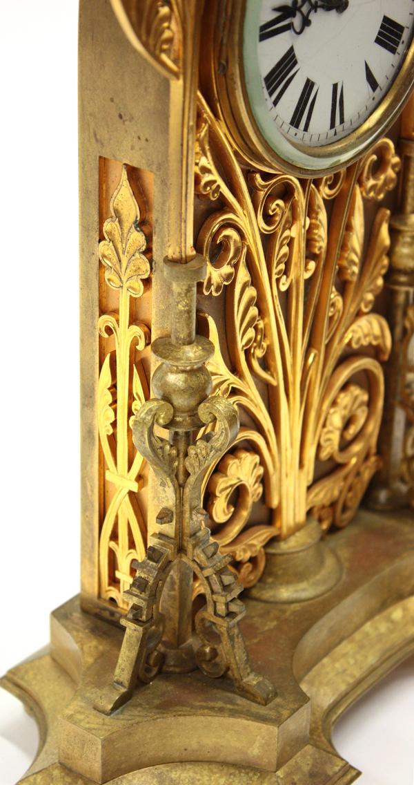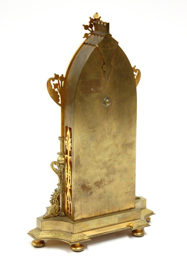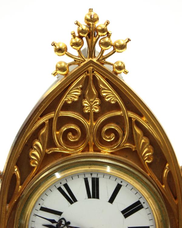 Tiffany & Co Gothic mantle clock, executed in gilt bronze and having a floral detail centering the Doxa, Switzerland 15 jewel movement fronted with an enamel face with Roman markers, the sides with conforming floral detail and rising on compressed bun feet, marked 'Tiffany and Comp., Union Square' on back, 14''h x 9''w x 3''d
