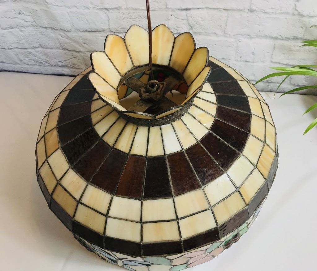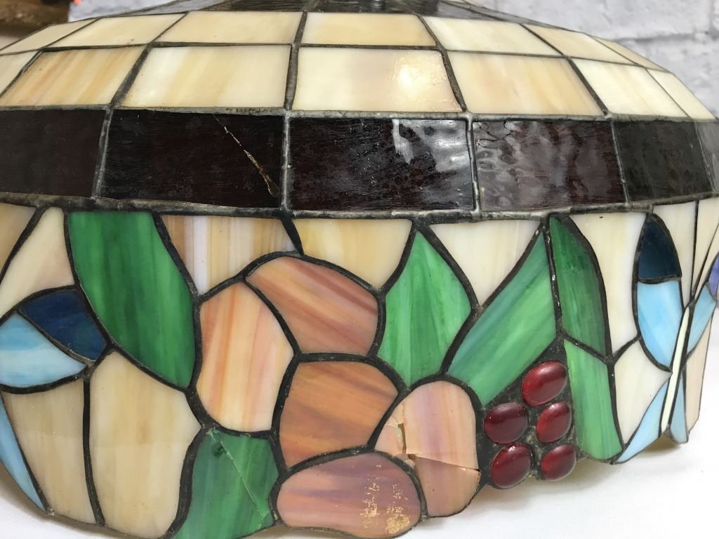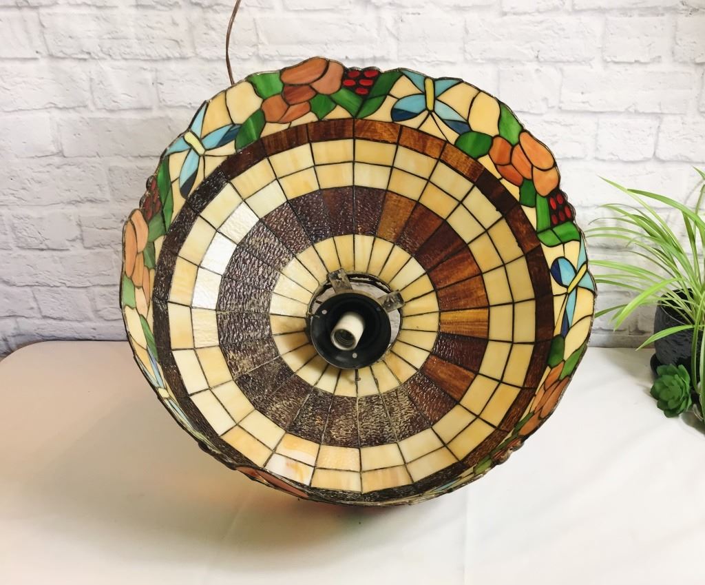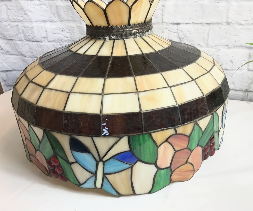 Vintage unsigned botanical theme with butterflies. 20 diameter by 14 high. Note: unfortunatly there is damage to one section as seen in pictures. Original owner visited the Tiffany factory and hand picked this