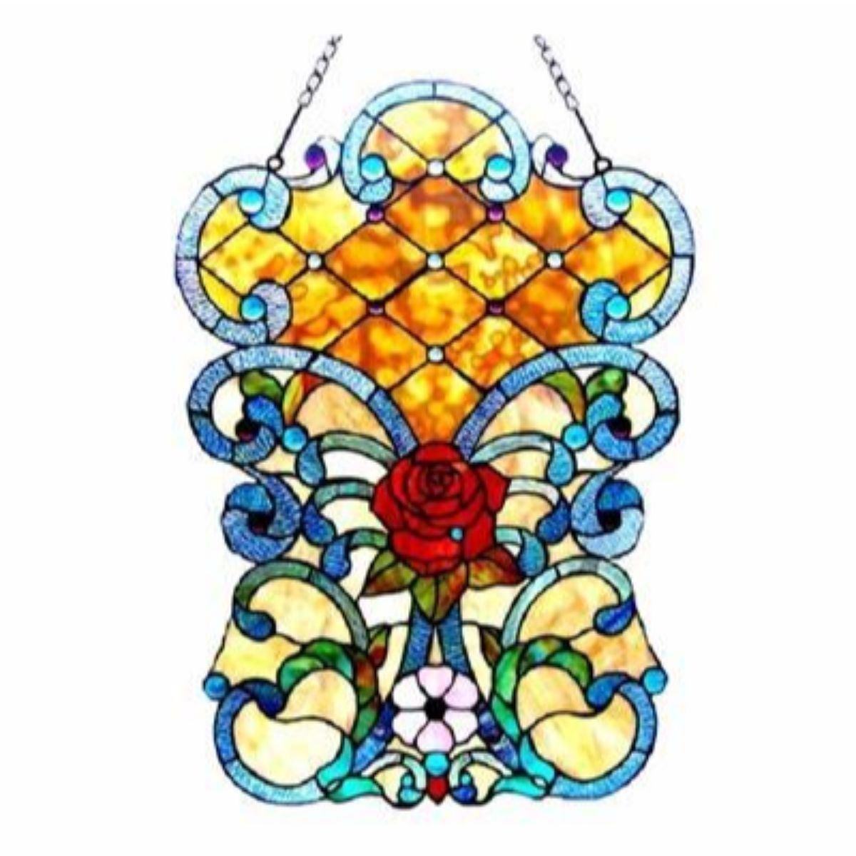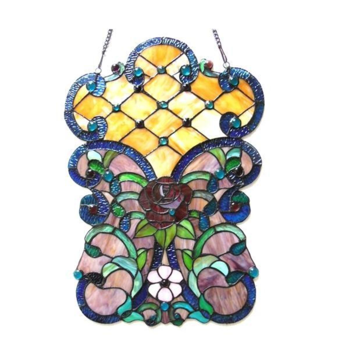 ROZE, Tiffany-style Victorian window panel is hand crafted featuring colorful pure stained glass.  Blossom is designed with intricate cut glasses and rich touches of colors.  This glass pieces are adorned with gems covered in soldered  and coated in a vintage patina tone. This is wonderful colorful addition to your window.  Only top quality materials used in this masterpiece. Est. Glass Beads29.00 Est. Glass Cuts241.00 Overall Width16.00 Overall Height24.00 Shade MaterialsTiffany-glass Specific UsesIndoor FinishBlack Consumer NoticeProposition 65 Panel Chain Length30.00 UPC Code091037691965 Net Weight (lbs)6.50 Shade ShapeRectangle Overall MaterialsGlass & metal