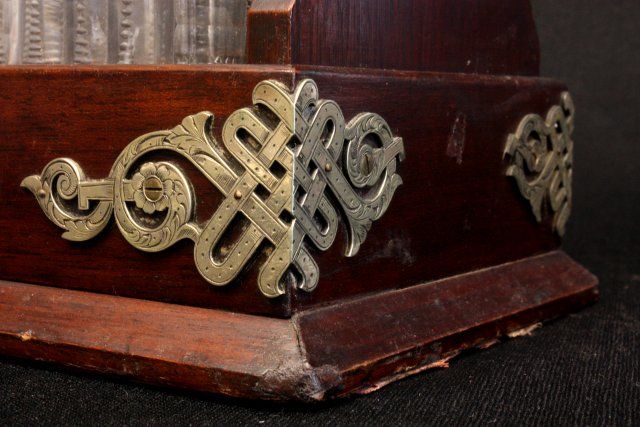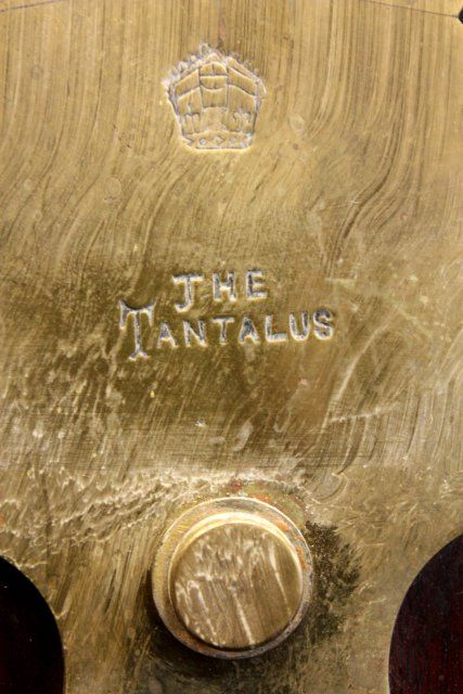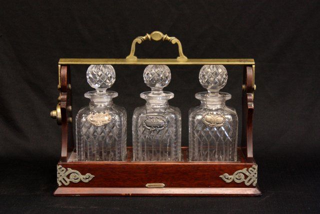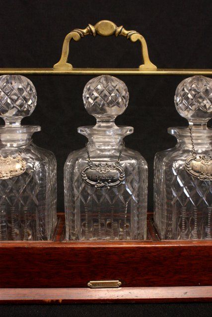 With 3 sterling hanging tags, "Brandy", "Bourbon" & "Rye", brass handle marked "The Tantalus". Approx. 13" H x 16" across x 6" D. Please read our terms of sale.