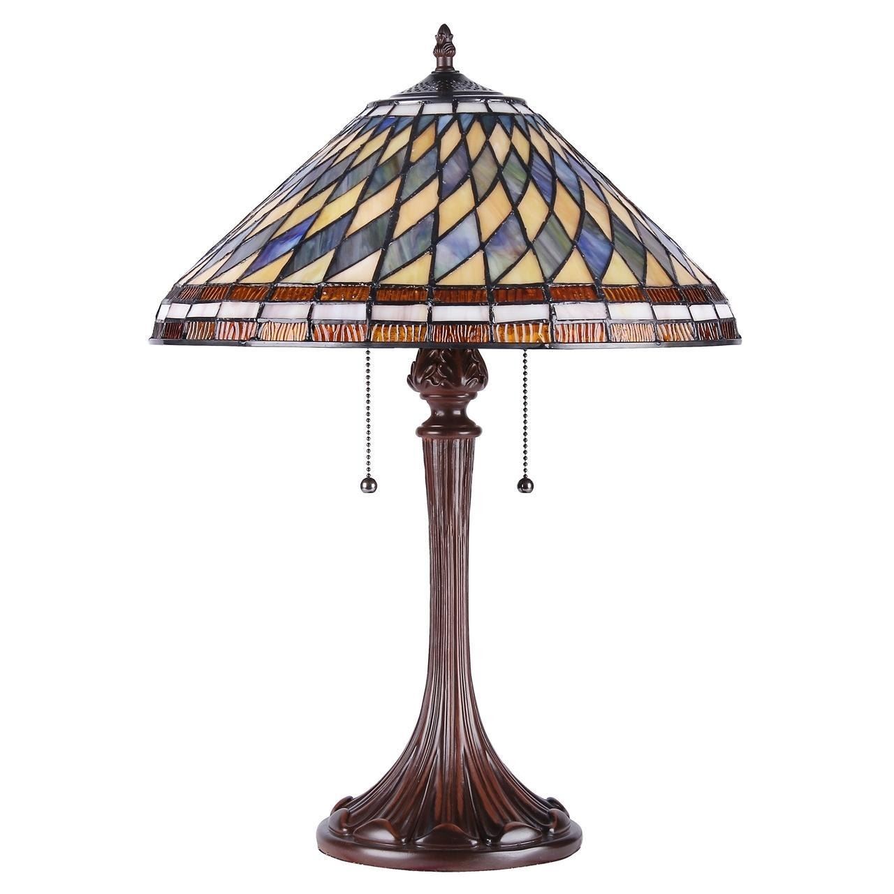 Tiffany-style 2-light table lamp in wavy patterns in blue, amber & dark brown colors, with 304 pieces of art glass The dark bronze base with textured black finish. 22 1/2" H. 16" shade. Â