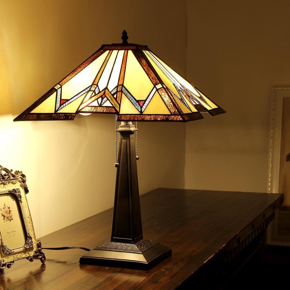 Geraint, a Mission table lamp that casts a traditional glow to your room. Featuring detailed geometric patterns in blue, beige and dark brown colors, this table lamp is perfect by your bedside or on your favorite reading desk. Glass TypeTiffany-glass Net Weight (lbs)9.66 Overall Length15.94 Overall Width15.94 Overall Height22.44 Overall Diagonal22.24 Shade Width15.94 Shade Height6.89 Shade Diagonal22.24 Base Width6.97 Base Height17.32 Base Diagonal9.65 Base/Stem MaterialsResin; Metal Electric Wire Length72 Threaded Pipe/Finial Length5.43 Threaded Pipe/Finial MaterialMetal Wattage/Bulb Types(2) 60 Watt max E26 Type A Bulb (not included) Switch TypePull chain Est. Glass Cuts160pcs glass cut Light DirectionDownlight Specific UsesIndoor FinishBlackish Bronze Overall MaterialsGlass, resin, metal & electrical components Glass Thickness0.12 Shade ShapeSquare CertificationUL Listed Consumer NoticeProposition 65 UPC Code602573220603