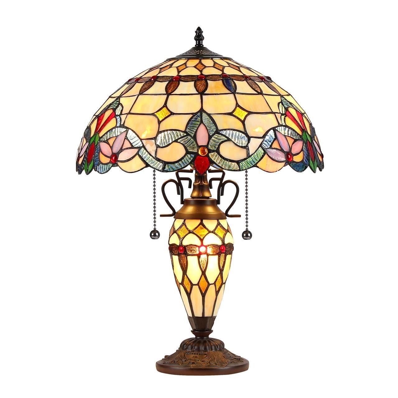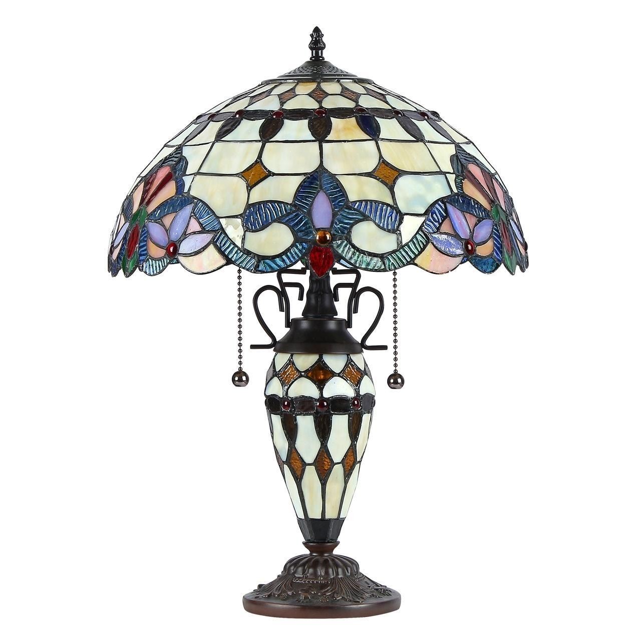 This Tiffany-style Victorian design 3-light double lit table lamp features a dark bronze finish and a lighted base that will complement many decors throughout your home. Handcrafted from individually hand-cut pieces of art glass that will add color and beauty to any space. Main colors are beige and blue. Shade Width16.10 Shade Height8.07 Overall Height22.40 Base Width6.10 Base Height17.70 Threaded Pipe/Finial Length5.40 Net Weight (lbs)8.38 Light DirectionDownlight Wattage/Bulb Types(2) 60 Watt E26 Type A Bulb + (1) 25 Watt E12 Type C Bulb (not included) Power SourceCorded, Electric Electric Wire Length70.00 Switch TypePull chain & on-cord rotary Shade ShapeRound Shade MaterialsTiffany-glass Glass Thickness0.12 Est. Glass Cuts393.00 Est. Glass Beads36.00 FinishDark Antique Bronze Overall MaterialsGlass, metal, resin and electrical components Specific UsesIndoor