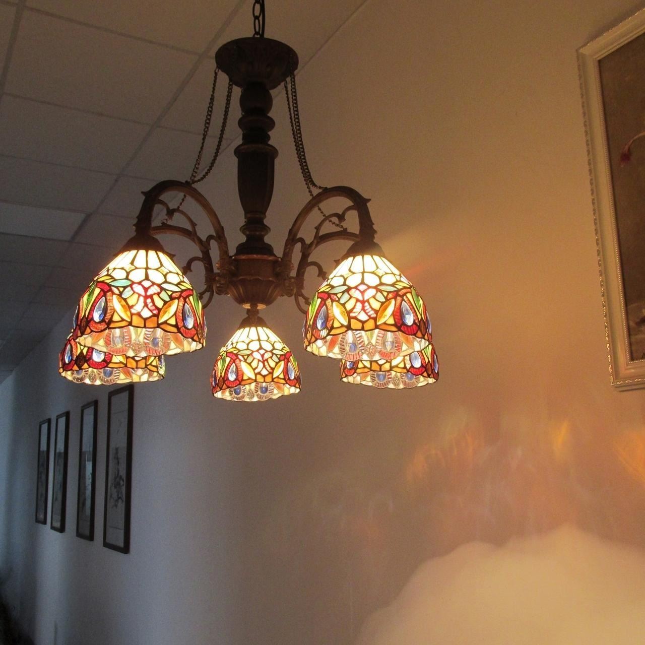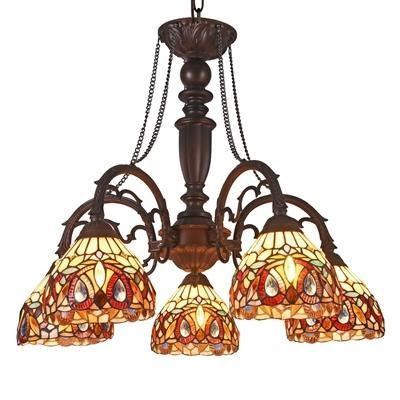 SERENITY, a Tiffany-style 5 light large chandelier is a gorgeous addition for any home, its bright colors will complement many of your homes decors. Hand crafted from 775 pieces of art glass and 35 beads that will add color and beauty to any space. Main colors are red, orange and black. Handcrafted using the same techniques that were developed by Louis Comfort Tiffany in the early 1900s, this beautiful Tiffany-style piece contains hand-cut pieces of stained glass, each wrapped in fine copper foil. Canopy Materials1.1" Canopy Width4.9" Ceiling Chain, Stem, Wire Length60 CertificationUL Listed Consumer NoticeProposition 65 Electric Wire Length74" Est. Glass Cuts775pcs glass cut, 35 glass beads FinishDark Bronze Glass Thickness0.12" Glass TypeTiffany Glass Wattage/Bulb Types(5) 60 Watt max E26 Type A Bulb (not included) Light DirectionDownlight Max Hanging Distance82" Mid-Stem MaterialsResin, zinc alloy, metal Mid-Stem(s) Height19.7" Mid-Stem(s) Width23" Net Weight (lbs)15.4 lbs Overall Height24.6" Overall Length27" Overall MaterialsGlass, resin, metal & electrical components Overall Width27" Shade Height4.9" Shade ShapeRound Shade Width7.1" Specific UsesIndoor