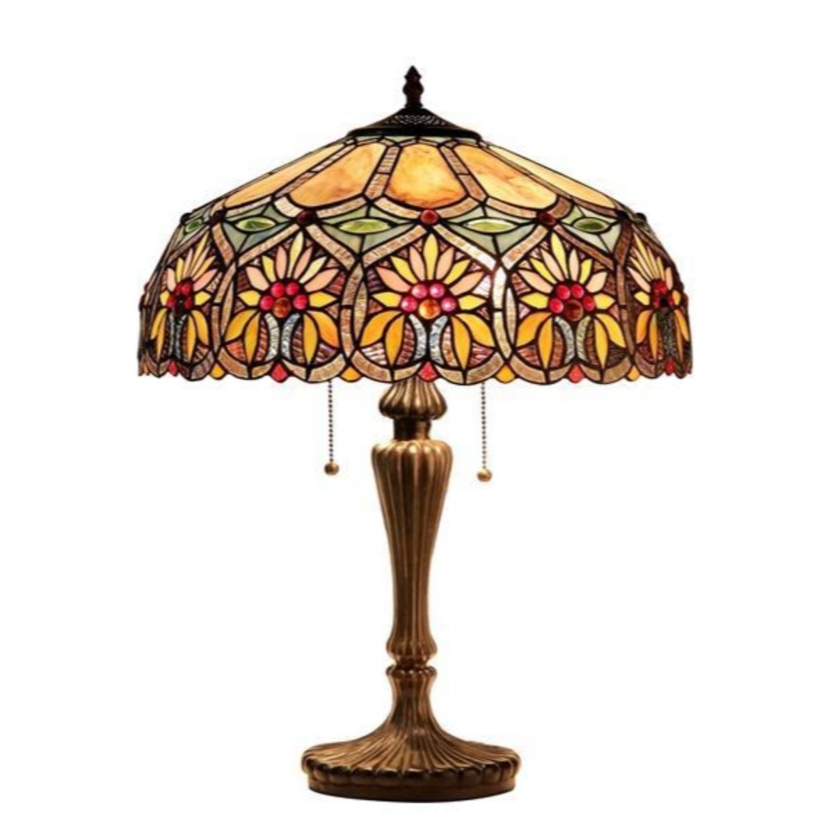 "SUNNY" Tiffany-style Floral 2 Light Table Lamp 18" Shade SUNNY, a Floral style table lamp will provide the design focal point for your home. Expand the effect by adding one or more of the other lamps in this design style. Expertly handcrafted with top quality materials including real stained glass, sparkling crystals, and gem-like cabochons. Shade Width (in) 17.70 Shade Height (in) 8.70 Overall Height (in) 24.60 Base Width (in) 6.70 Base Height (in) 17.70 Threaded Pipe/finial Length (in) 6.20 Net Weight (lbs) 11.70 Light Direction Downlight Light Bulb Types (2) 100 Watt Max E26 Type A Bulb (not Included) Power Source Corded-electric, Wall Plug Electric Wire Length (in) 70.50 Switch Type Pull Chain Shade Shape Round Shade Materials Tiffany-glass Glass Thickness (in) 0.12 Est. Glass Cuts 636.00 Est. Glass Beads 72.00 Finish Dark Antique Bronze Overall Materials Glass, Resin & Electrical Components Specific Uses Indoor Â