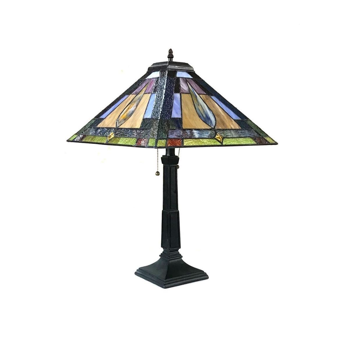 Tiffany-style colored slag glass Mission-design 2 light table lamp with dark antique bronze finish, handcrafted from over 120 pieces of art glass & 4 glass beads wrapped in fine copper foil. Overall Height 24". 16" shade. 9lbs weight. Â