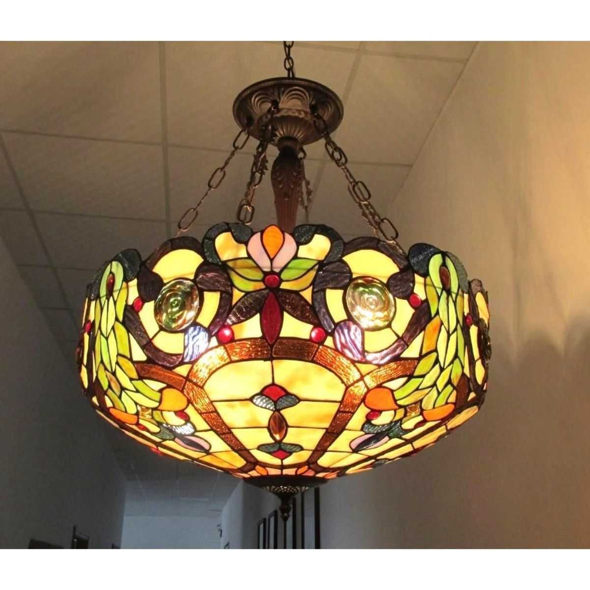Tiffany-style stained-glass 4-light inverted ceiling pendant,made of 512 cuts of art glass & 40 glass beads set into copper with a dark antique bronze finish. 24" W X 24" H shade.18.96 lb weight.