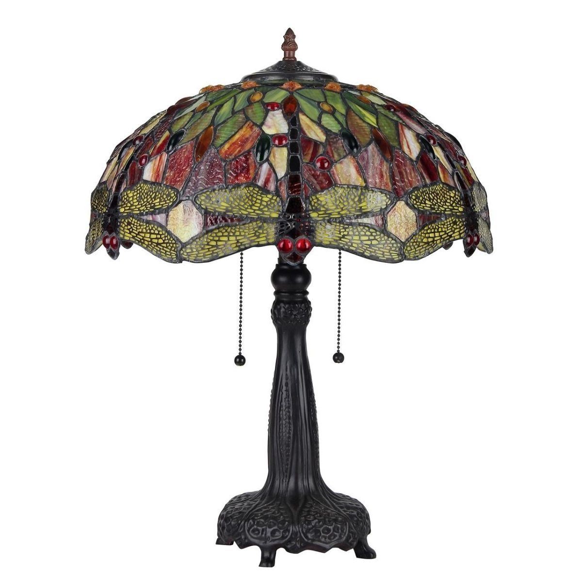 Tiffany-style stained glass dragonfly 2 light table lamp, handcrafted with 276 glass cuts & 54 glass beads wrapped in copper foil with antique dark bronze finish base. 24" overall height.18" wide shade. Â