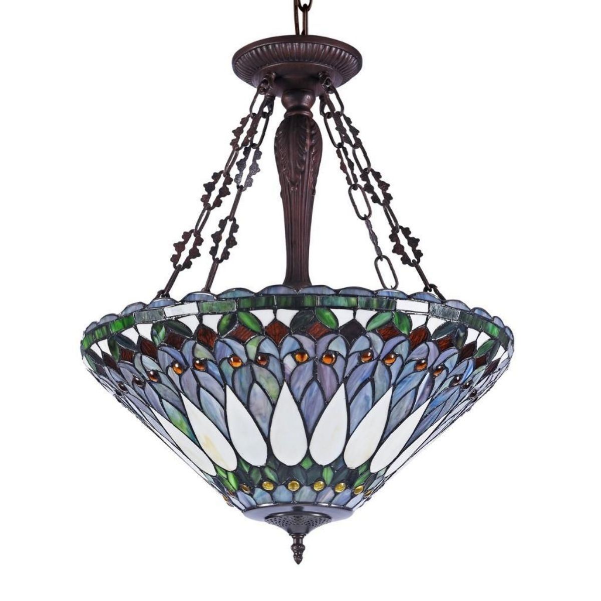 Tiffany-style 3-Light Inverted Ceiling Pendant with 450 pieces of stained art glass & 54 glass beads wrapped in copper foil with dark antique bronze finish. 25