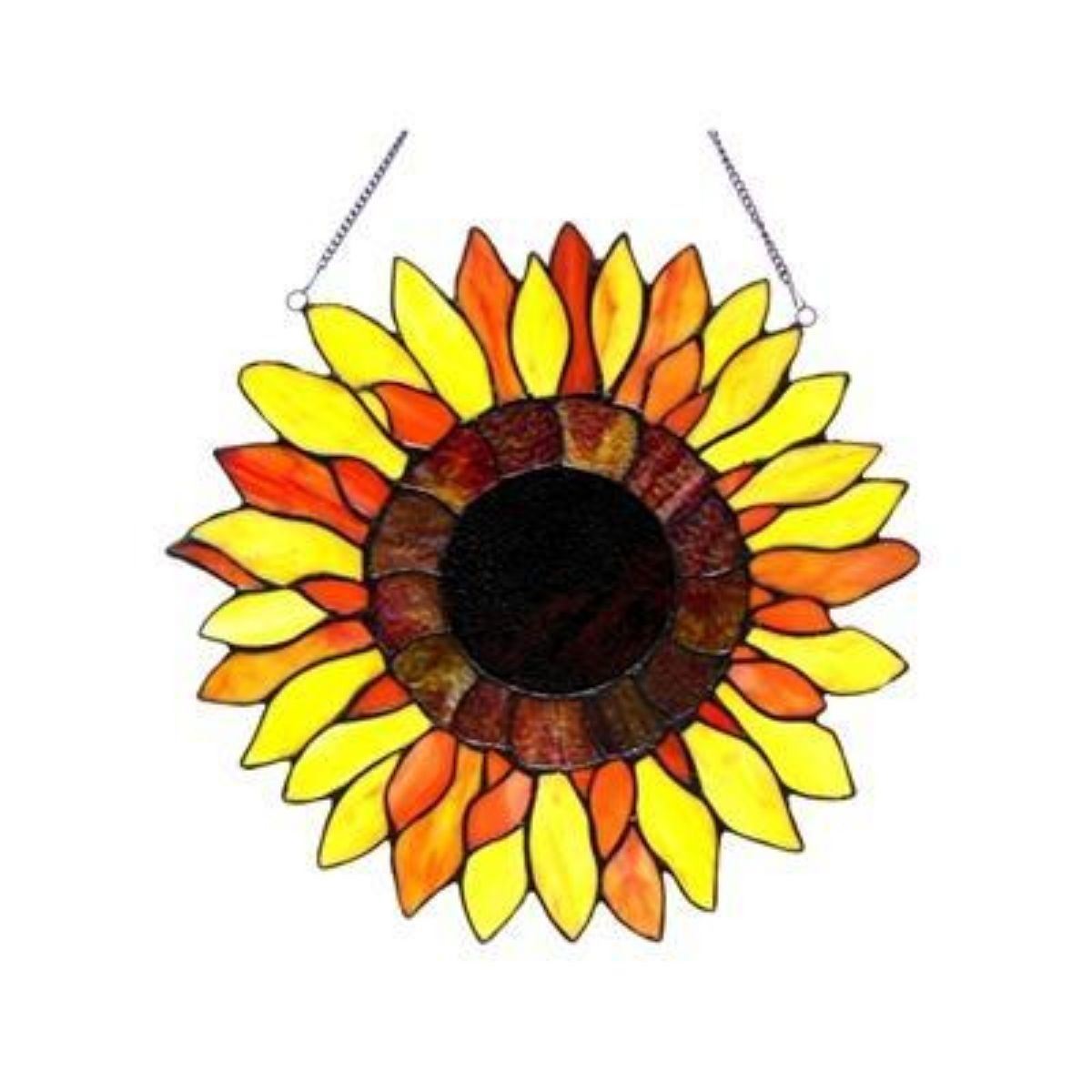 Tiffany-style sunflower design window panel, hand-crafted with colorful stained art glass. 16"D. Comes with hanging chain. Â