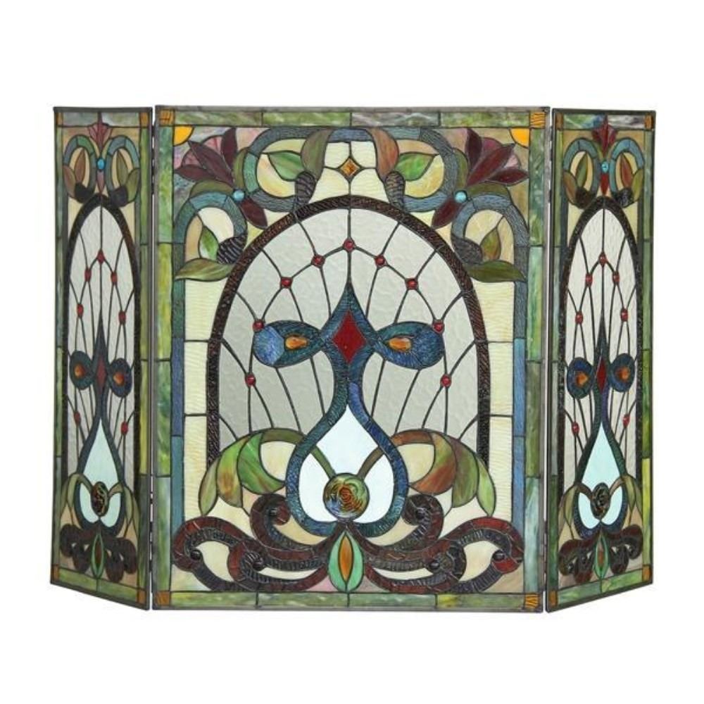 RUBY, a Victorian vintage fireplace screen comes to life with beautiful arrangements of stained glass giving a colorfully array of warmth. Hand crafted using top quality glass piece adorned with a metal frame coated in a vintage patina. Wonderful addition to any fireplace. Overall MaterialsGlass & copper frame Est. Glass Beads41.00 Est. Glass Cuts580.00 Overall Width43.40 Overall Height27.80 Shade MaterialsTiffany-glass Est. Marble BeadsN/A Specific UsesIndoor Consumer NoticeProposition 65 UPC Code091037950901 Net Weight (lbs)18.30 Est. Glass Crystals13.00 Cntr Pane Width21.70 Cntr Pane Height27.80 Side Pane Width10.70 Side Pane Height27.80 Glass Thickness0.12