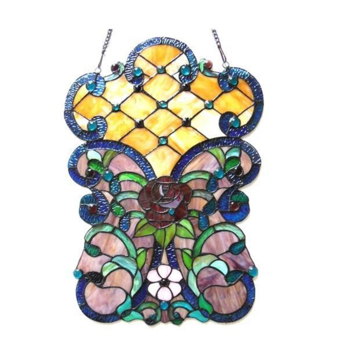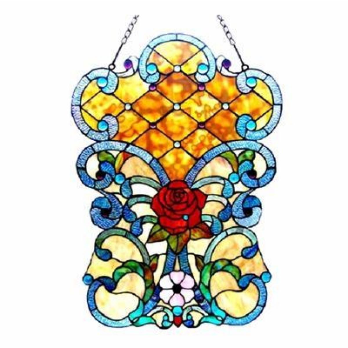 Tiffany-style Victorian rose stained glass window panel, handcrafted featuring 241cuts of stained glass & 29 glass gems. 16" X 24". 6 1/2 pound weight. Â
