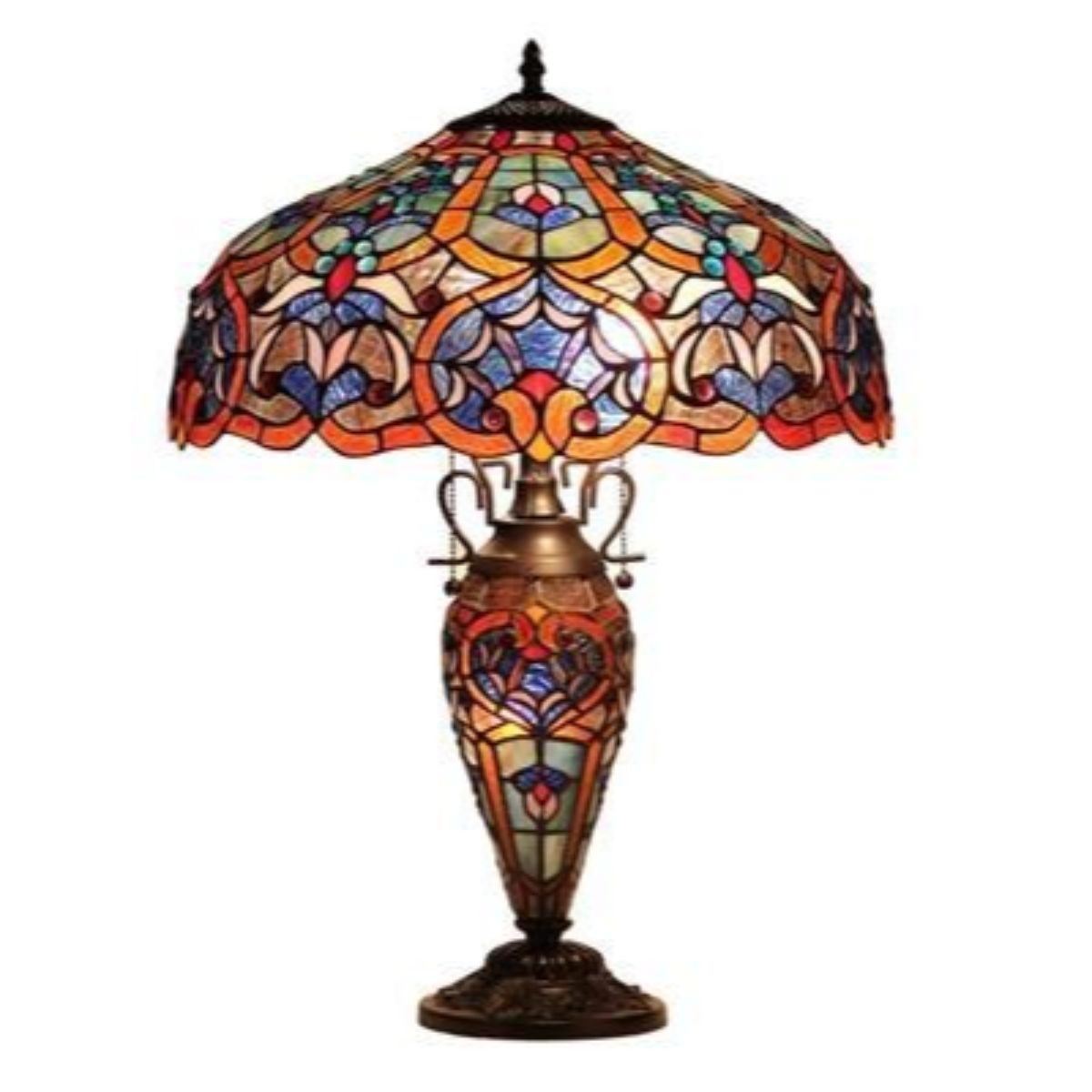 Tiffany-style Victorian 3 light double-lit stained glass table lamp with 18" shade. 731 glass cuts & 118 glass beads. Antique bronze metal finish base. 25 1/2" H. 11-pound weight. Â