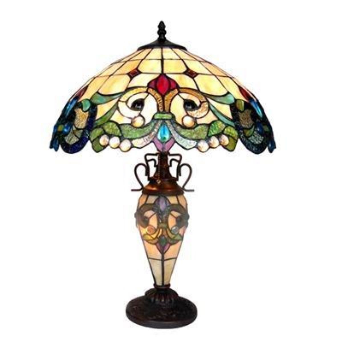 Tiffany-style Victorian double lit table lamp, handcrafted with stained glass ( 510 cuts & 63 glass beads ) & dark antique bronze finish base. Overall Height 24". Base - 18" H X 6 1/2" W. Shade - 8" H X 18" W. Â