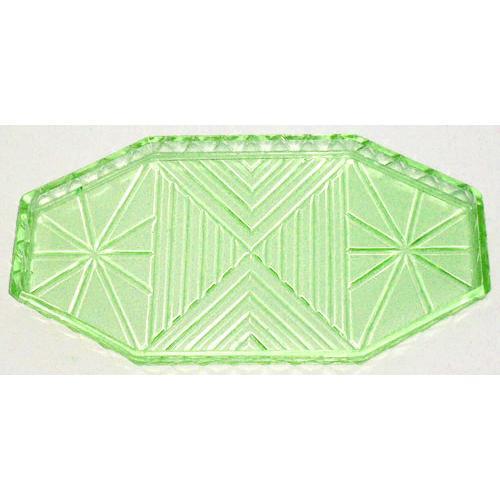 A fantastic find, this sensational green Depression glass vanity tray is part of the 'Chipperfield' Art Deco vanity set, named by Hazel Marie Weatherman and shown on page 131 of Whitmyer - Bedroom & Bathroom Glassware of the Depression Years who attributes it to Tiffin / US Glass. With an eight sided Art Deco geometric design this rare tray is in excellent condition.