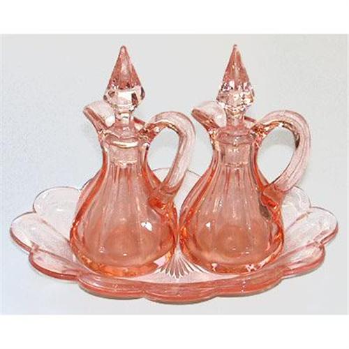 This is the very hard to find complete set of gorgeous Tiffin / US Glass pink Depression Glass oil & vinegar cruets with their matching tray. The cruets measure 6 1/2 inches tall x 3 1/4 inches at their widest point, the tray is 7 1/2 inches x 5 1/4 inches This beautiful pink Depression Glass cruet set is listed in Florence - Kitchen Glassware of the Depression Years. The cruets, their stoppers and the tray are all excellent condition