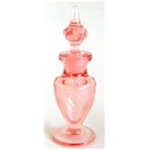 This gorgeous Art Deco pink Elegant Depression glass perfume bottle is part of a dresser set produced by the Tiffin Glass Co., circa 1930. It is known as MILADY and is shown and described on pages 136-137 of Whitmyer - Bedroom & Bathroom Glassware of the Depression Years. Featuring a swirl pattern throughout its pear shaped footed base, and its pointed knobbed stopper. Measuring 5 1/2 inches tall including stopper and, excepting a broken dauber, is in excellent condition. There is a matching perfume bottle, powder jar and dresser tray, from this set, available in separate auctions.