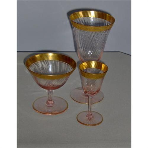 From the Depression years of the 1930s, it is handblown pink lead crystal in an optic design with a gold etched overlay. Shown here in a representative place setting of three (3), I have in total three (3) claret wine glasses, six (6) low sherbets, and four (4) cordials or aperitifs available. The gold overlay etching is featured on Tiffin?s Minton pattern.<p>