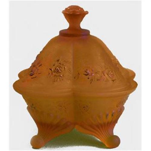 <table width="100%" border="0" cellspacing="0" cellpadding="4"><tr><td><em> </em></td></tr><tr> <td width="100%"> This outstanding candy or dresser jar was produced by the Tiffin Glass Co., circa 1925, from their Roses line, and shown Pina and Gallagher: Tiffin Glass 1914-1940. The lid features a gold painted rose finial, a frieze of gold roses above the rim and is divided into four curved sections. The base is also adorned with a frieze of gold roses, below the rim and above, four ornate fan shaped feet. Measuring 6 inches tall x 5 1/4 inches across and, with the exception of moderate wear to the gold decoration due to age, is entirely in excellent condition </td></tr><tr> <td> </td></tr><tr> <td>Reference #: tsTRAGFJ</td></tr><tr><td>Condition:Excellent</td></tr><tr><td>Year:circa 1925</td></tr><tr><td>Title:Tiffin ROSES Footed Amber w/ Gold Jar</td></tr><tr><td>Location:Orlando, Florida</td></tr></table>