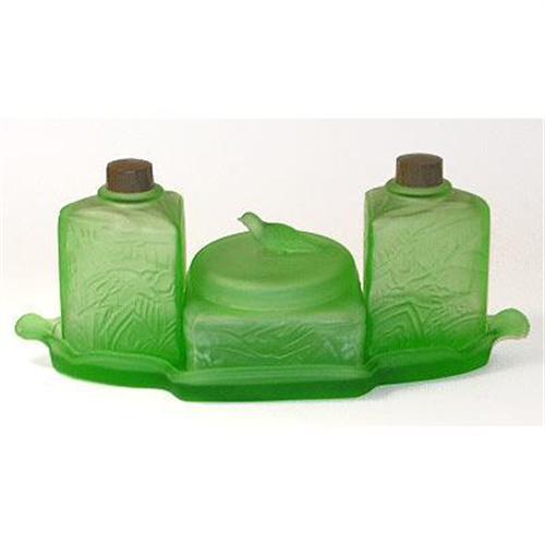 Produced by Tiffin Glass for Dermay of Fifth Ave, circa 1930. Known as the Tweety Bird vanity set and shown on pg 133 of Whitmyer - Bedroom & Bathroom Glassware of the Depression Years this complete green satin Elegant Depression pressed glass vanity set consists of two lotion bottles triangular in shape, two sides have scenes of birds in flight against a background of foliage, while the third side depicts geometric shapes. They measure 4 inches tall x 2 3/4 inches across the base and still have their original brown Bakelite screw on tops. The lid of the powder jar features a figural bird - Tweety - the base matches the pattern on the bottles and measures 4 inches square x 3 1/4 inches tall the tray measures 11 1/2 x 4 1/2 inches. The entire set is in excellent condition