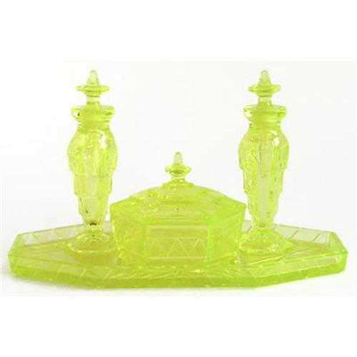 <tr><td>Title:Tiffin Vaseline Glass Art Deco Vanity Set</td></tr>