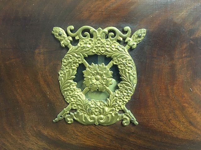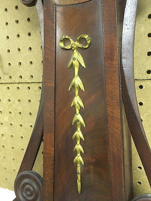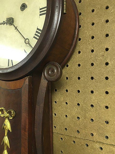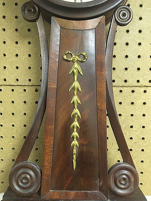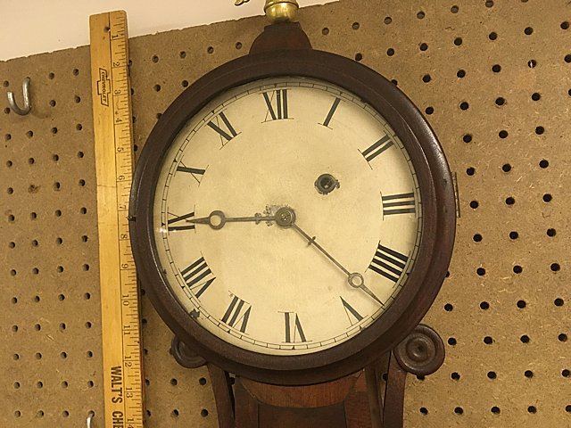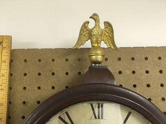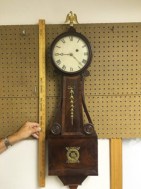 Attributed to Horace Tifft, c. 1840s, mahogany banjo clock with burl panels and brass accents on throat and lower door, carved side arms. Weight driven, nice antique banjo clock with key wind and pendulum, eagle finial with hand written note on inside door "J. J. Beals, 25 Slate St., cleaned and new cord, April 3rd, 1913.