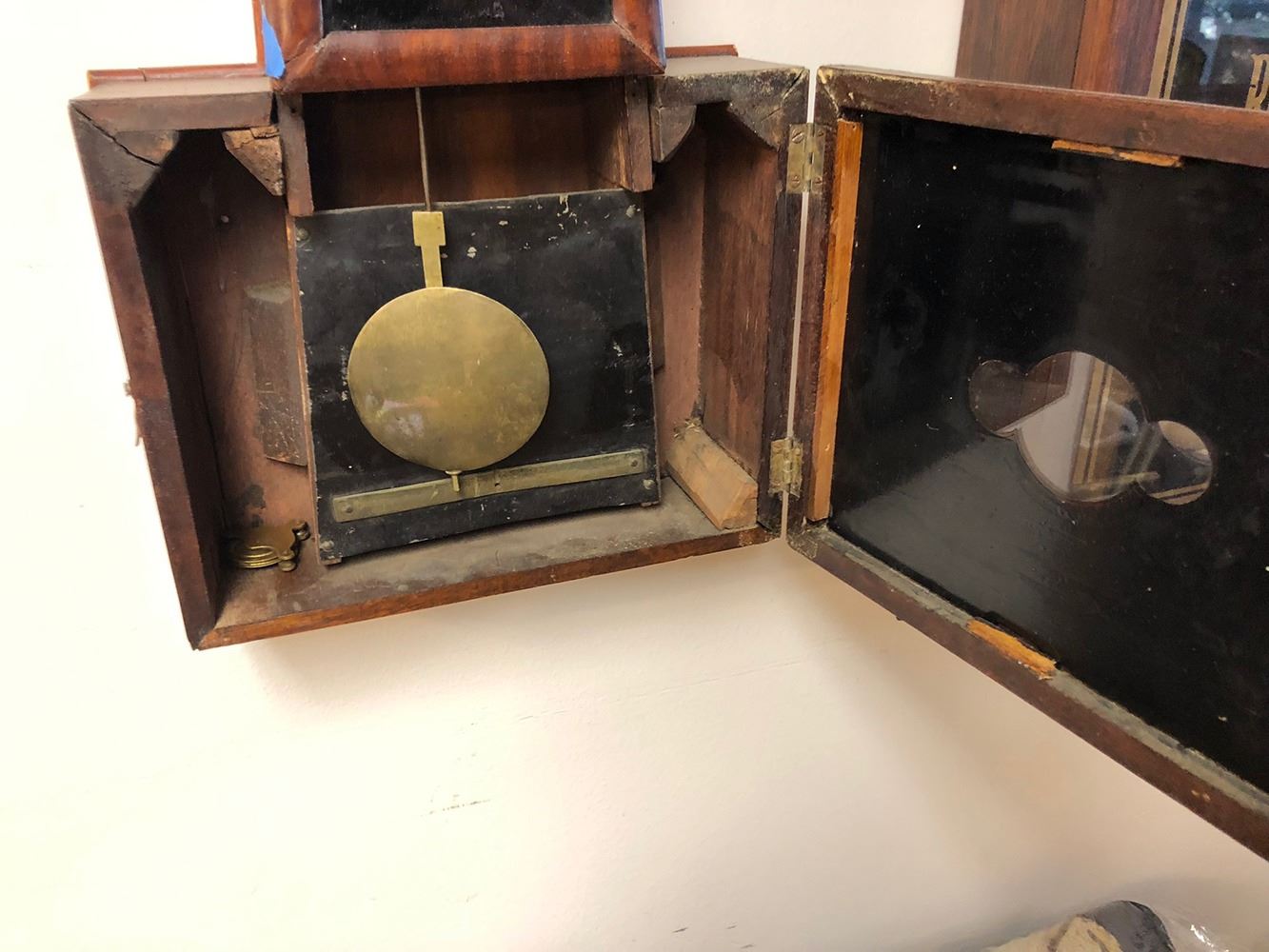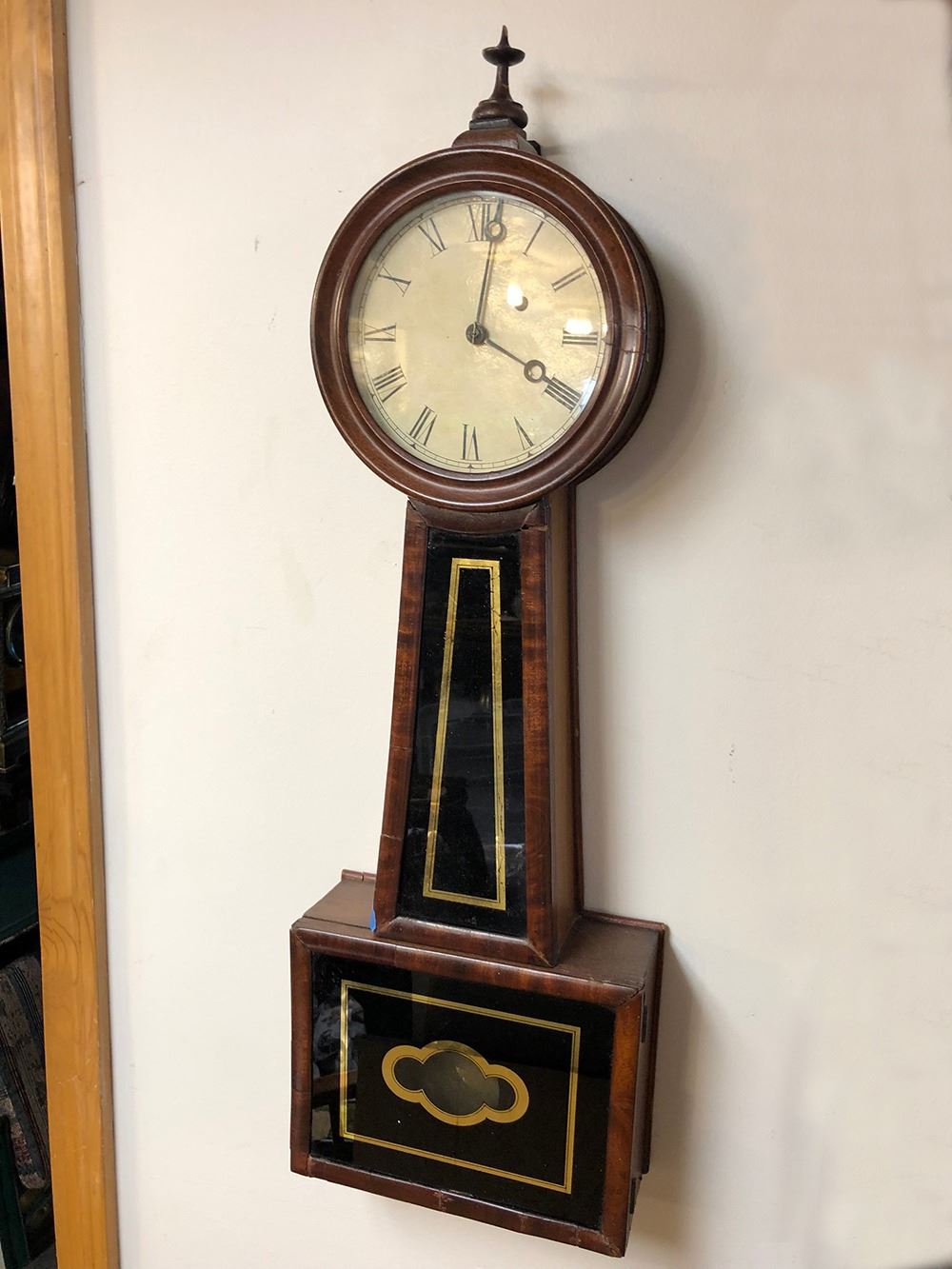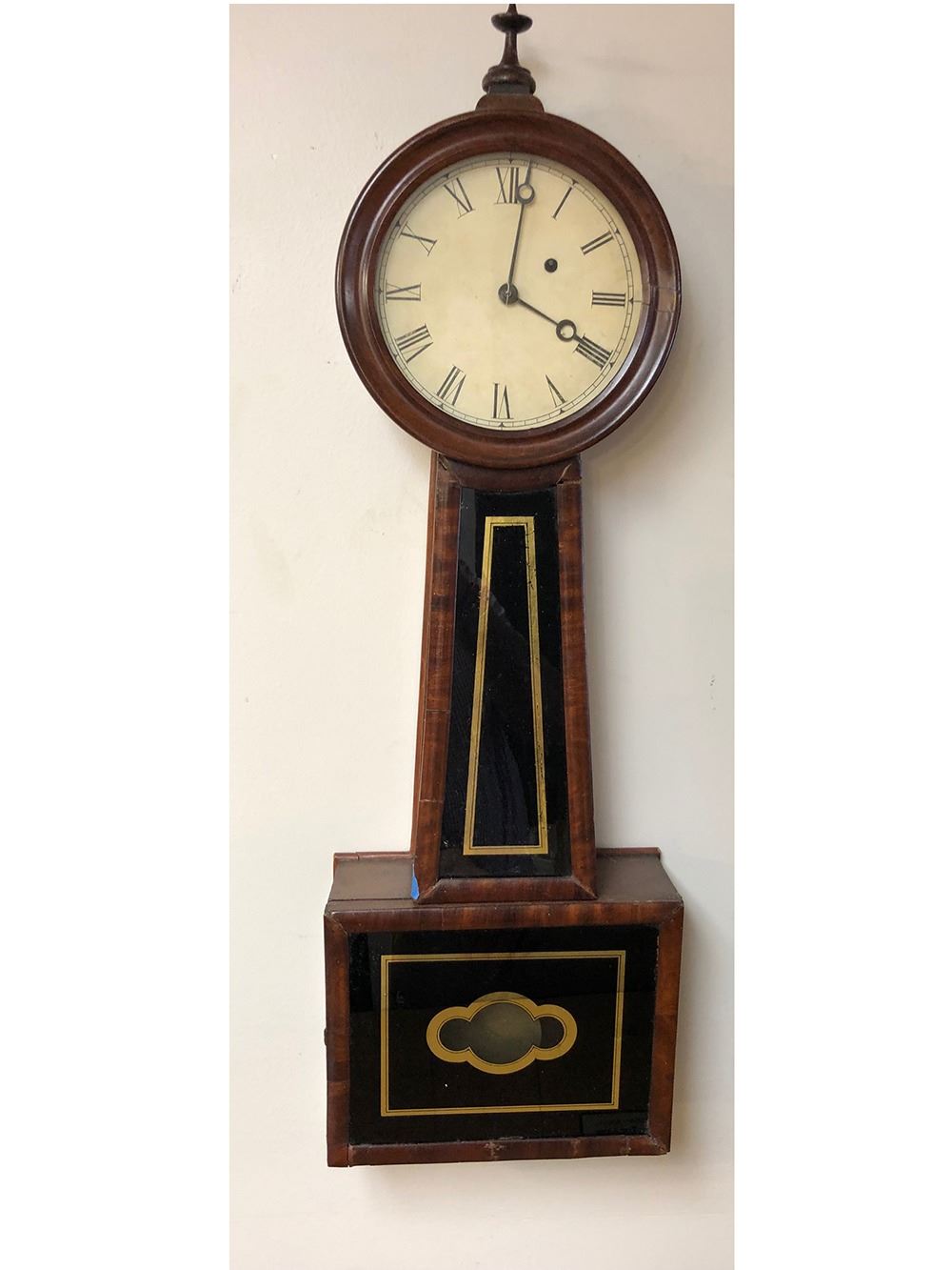 Civil war era Tift style banjo clock, very nice case with burled wood, black and gold glass, pendulum.