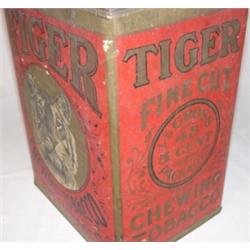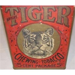 Tiger Chewing Tobacco advertisement tin; paper on tin. Measures 10 1/2" tall and has minor losses. Overall is in very good condition.
