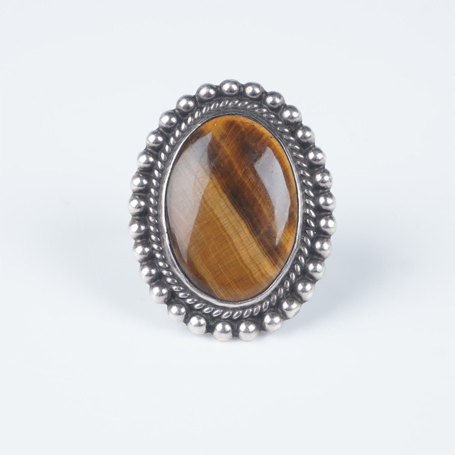 A striking ring featuring a polished tiger eye stone set in a silver tone oval bezel with a scalloped edge and bead-like accents. The ring features an adjustable band for a customizable fit, making it versatile and suitable for various sizes. The tiger eye stone centerpiece measures approximately 1.5"H and displays the captivating chatoyancy typical of the gemstone. Unmarked for metal content. A timeless design, perfect for collectors or as a statement accessory.