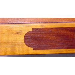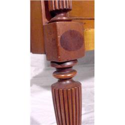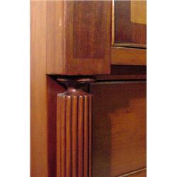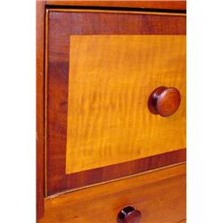 Sheriton cherry and tiger maple 4-drawer chest, Ca. 1840; the overhanging top drawer is set with a panel of strong tiger maple veneer which is surrounded with a crotch mahogany veneer border; the drawer is supported by two full reeded columns which extend from the base; the fine tapering legs are similarly reeded; the drawers are mounted with wooden knobs; the skirt is set with a tiger veneer band which is mounted with a mahogany veneer panel at the center; the ends are paneled; professionally refinished; drawer runners are re-fitted; 45.25" long x 22" deep x 49" tall