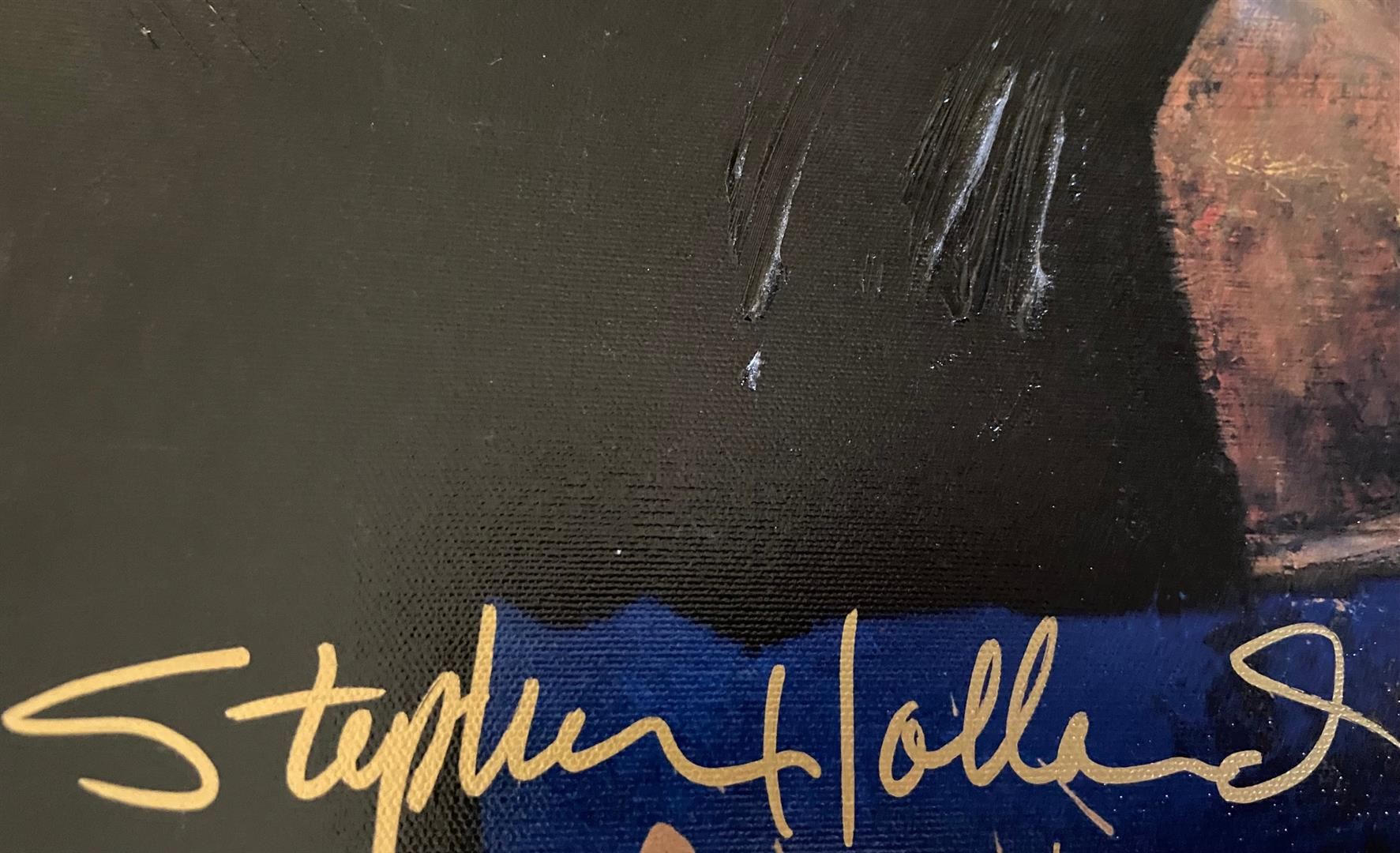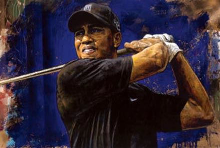 A rare limited Edition giclee on stretched canvas by renowned Sports Artist Stephen Holland, signed by Tiger Woods and by Holland . . With COA hologram. 41.5x28" Ready to hang or be framed.