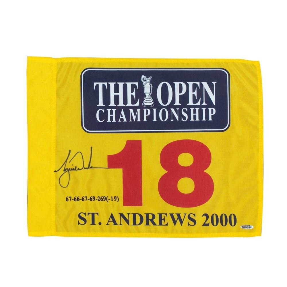 The British Open, referred to simply as The Open in golf circles, is the oldest and in many ways the most difficult of the four major golf championships. The 2000 Open was the 129th in the tournament's history, and it was highlighted by the incredible performance of Tiger Woods. At the age of 24, Woods captured his first British Open and fourth major title overall with an eight-stroke win over Ernie Els and Thomas Bjorn. More importantly than it being his fourth major, it was historic because it gave Woods the career grand slam. He became just the fifth golfer in history to accomplish the feat and youngest by two years, beating the record held previously by Jack Nicklaus. This 18th hole pin flag is embroidered with Woods final score from that epic weekend. Woods has autographed this embroidered 2000 British Open pin flag in black paint pen. His signature is deemed authentic by virtue of Upper Deck Authenticated Five-Step Process.