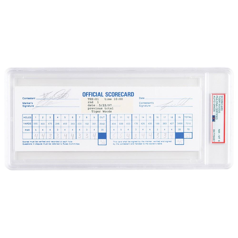 Official match-used golf scorecard for Tiger Wood& rsquo;s first round at the MasterCard Colonial National Invitation on May 22, 1997, 10 x 3.5, signed in pencil by Woods in the & lsquo;Contestant& rsquo;s Signature& rsquo; field. Woods finished the round with a score of 67 and ultimately tied for fourth at -12 and a total score of 268. In fine condition. Encapsulated and graded by PSA/DNA as "NM-MT 8."