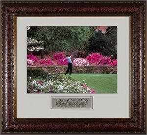 Tiger Woods achievements to date rank him among the most successful golfers of all time. He was the highest-paid professional athlete in 2008, having earned an estimated $110 million from winnings and endorsements. This is an unsigned 11x14 photograph of Tiger Woods "Azaleas" on the way to victory at the 2002 Masters at Augusta National. Custom Leather Framed and Premium Matted as shown.