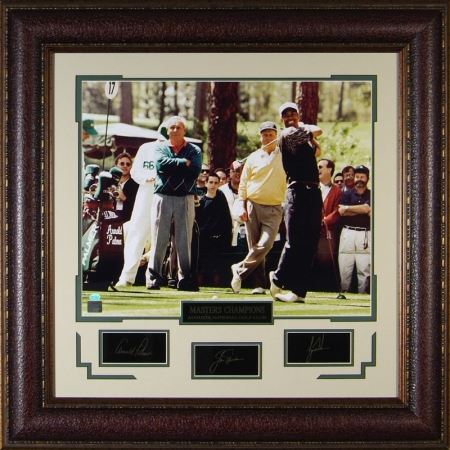 Arnold Palmer has won numerous events on both the PGA Tour and Champions Tour, dating back to 1955. Nicknamed "The King," he is one of golf's most popular stars and its most important trailblazer because he was the first star of the sport's television age, which began in the 1950s. Palmer won the PGA Tour Lifetime Achievement Award in 1998, and in 1974 was inducted into the World Golf Hall of Fame. Jack Nicklaus, also known as "The Golden Bear", is regarded by many as the greatest professional golfer of all time. Over the course of this 25-year period of 100 major championships as a professional, Nicklaus finished either first or second 36 times, in the top three 45 times, the top five 54 times, and the top 10 67 times. Tiger Woods achievements to date rank him among the most successful golfers of all time. Currently the World No. 1, he was the highest-paid professional athlete in 2008, having earned an estimated $110 million from winnings and endorsements. He has more career major wins and career PGA Tour wins than any other active golfer. This is a Tiger Woods, Arnold Palmer, and Jack Nicklaus custom premium framed unautographed Signature Series Engraved oversize 30x32 piece. Unique collectible of one of the all time golf greats with special engraved signature plates.