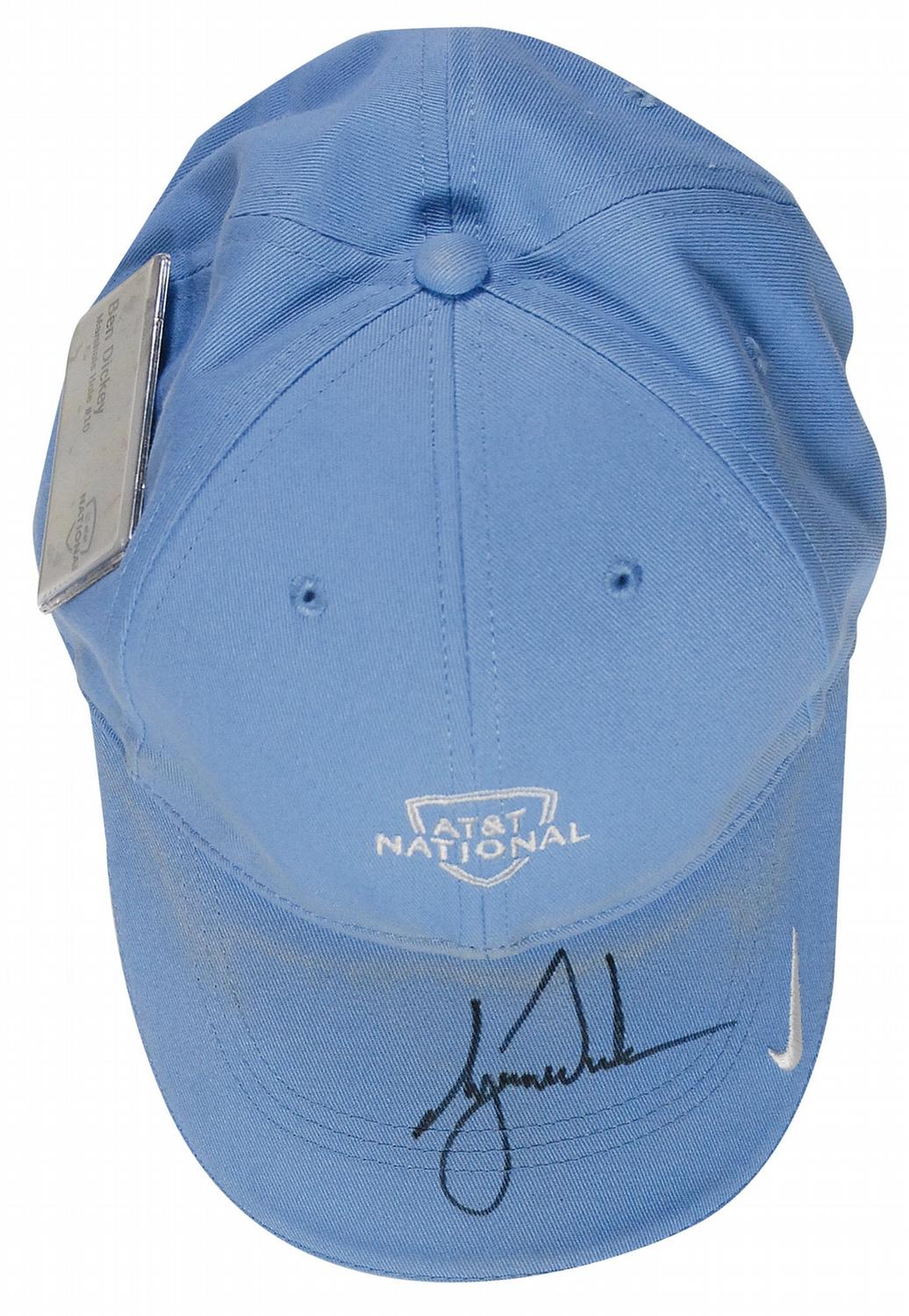 AT&T National baseball-style light blue cap signed in black felt tip on the brim. With some staining on the cap and brim touching the top of the signature, otherwise fine condition. The consignor notes that the signature was obtained by a hole marshal, whose badge is attached to the cap. Woods appeared in several AT&T tournaments throughout his career, with the company being one of his personal sponsors up to 2010.