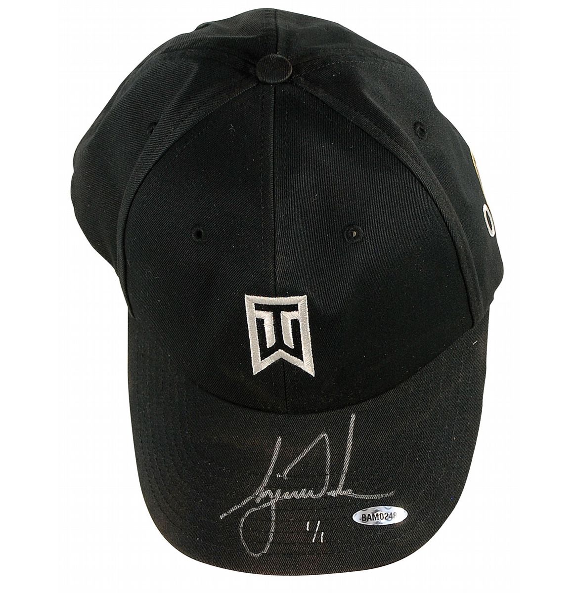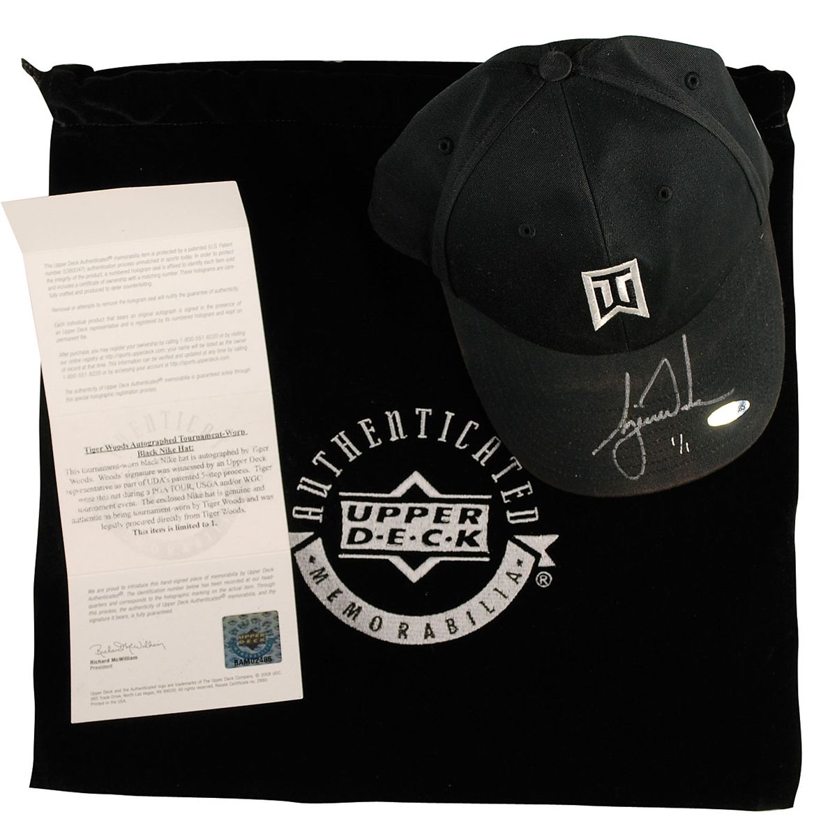 Incredibly rare limited edition Tiger Woods TW tournament-worn golf hat, #1/1 signed in silver ink on the brim. In fine condition, with expected wear and light discoloration from perspiration. Accompanied by a certificate of authenticity from Upper Deck, as well as its original cloth bag and Upper Deck box. One of the most difficult to acquire of all Woods’ Upper Deck authenticated items.