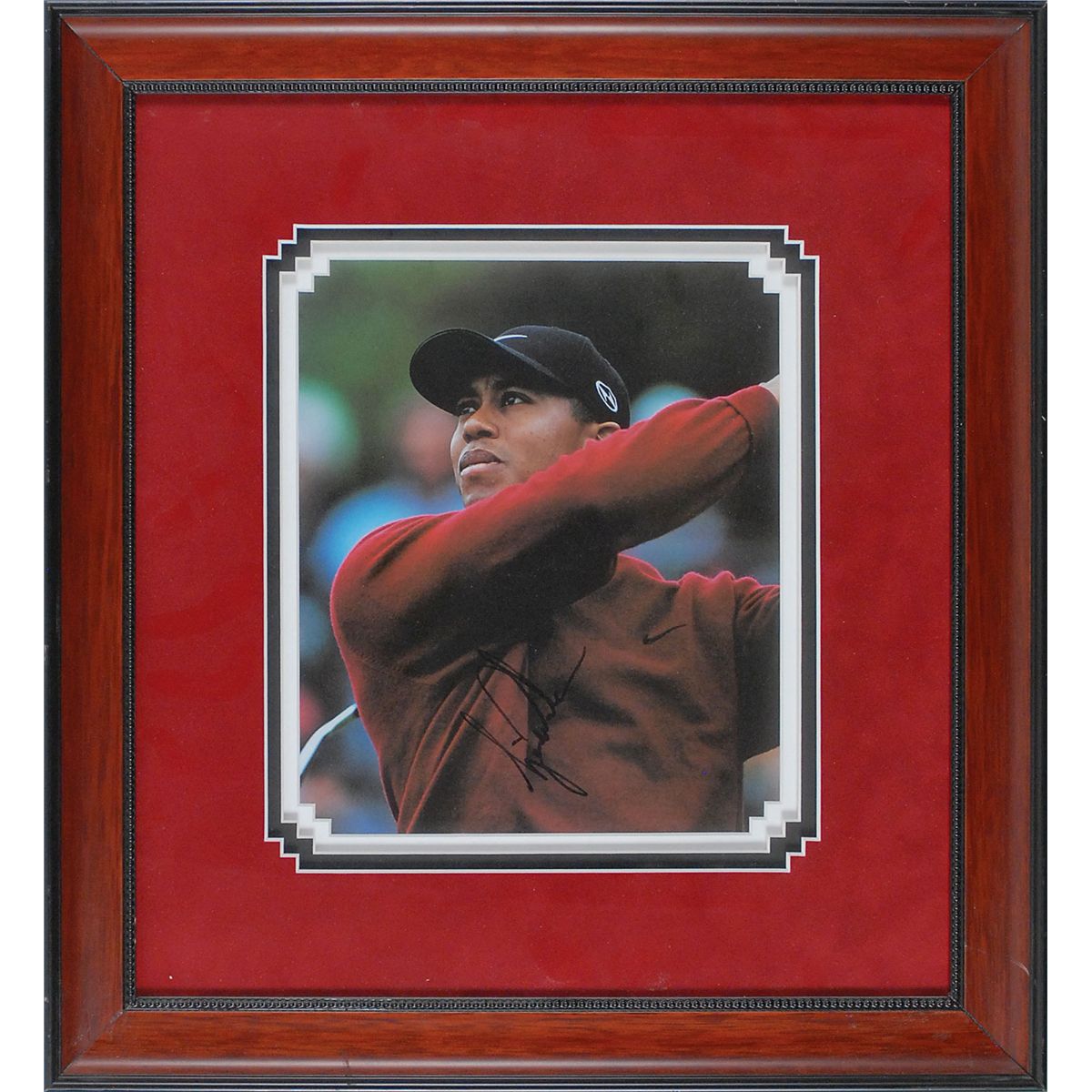 Color 7.75 x 9 program photo of Woods in his follow-through, signed in black felt tip. Attractively triple-suede-matted and framed to an overall size of 16 x 17.5. In fine condition.