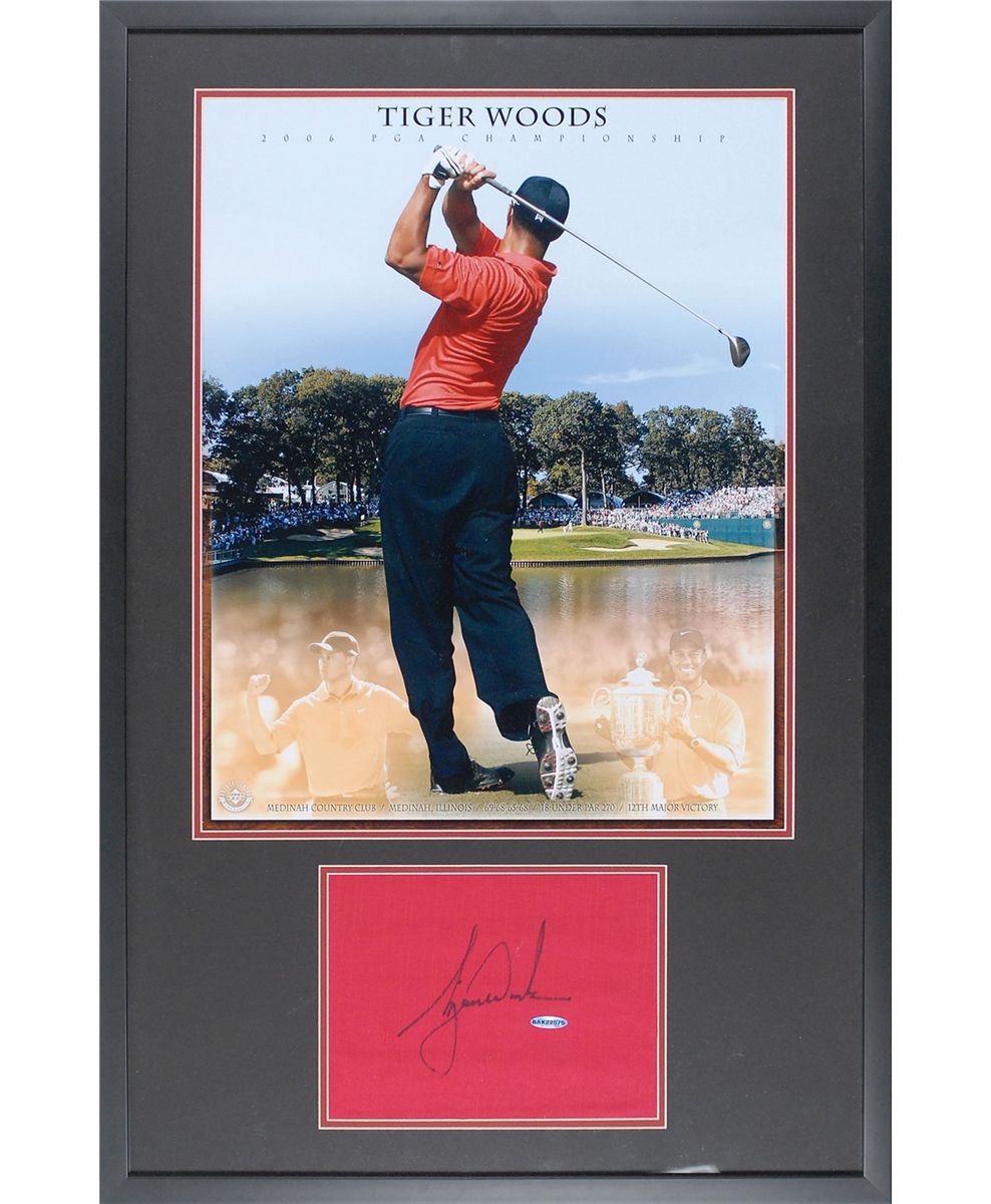 Large swatch of red shirt fabric, 8.75 x 6.5, prominently signed in black felt tip by Woods. Nicely double-matted and framed with a color composite photo showing Woods during his victory at the 2006 PGA Championship. In fine condition, with an Upper Deck authentication label affixed below the signature. Accompanied by a certificate of authenticity from Upper Deck.