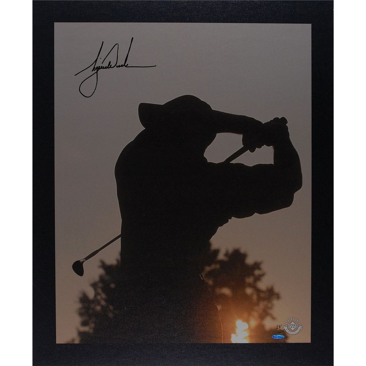 Gorgeous color limited edition 24 x 29 print on canvas showing Woods silhouetted against the sky after a swing, numbered 13/100, prominently signed in the upper left in black ink. Rolled and in fine condition, with an Upper Deck authentication label affixed to the lower right (certificate of authenticity not present).