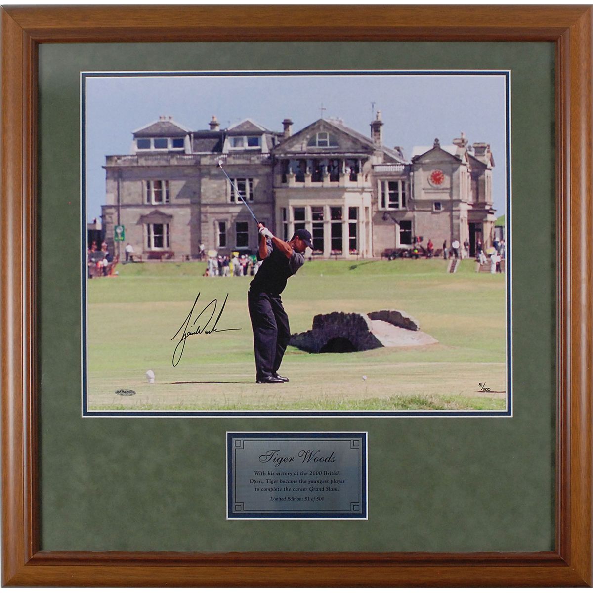 Limited edition color glossy 19.5 x 15.5 photo of Woods at the 2000 British Open, numbered 51/500, signed in black felt tip. Beautifully double-suede-matted with a descriptive plaque and framed to an overall size of 28 x 28. In fine condition, with an Upper Deck authentication label affixed to lower left. Accompanied by a certificate of authenticity from Upper Deck and ‘PenCam’ CD. Oversized.