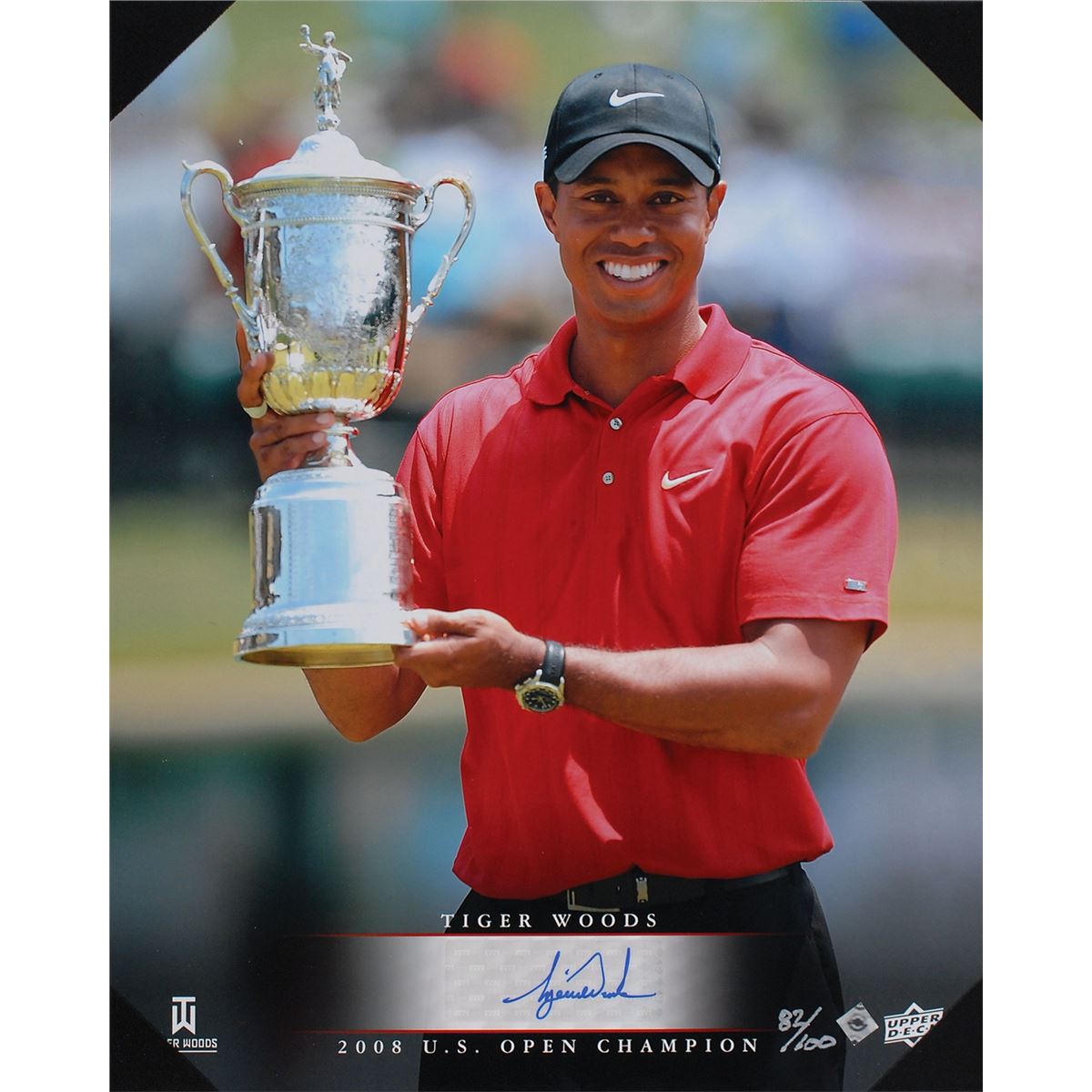 Limited edition color satin-finish 8 x 10 Upper Deck photo of Woods winning the 2008 US Open, numbered 82/100, signed in blue felt tip on a holographic Upper Deck label affixed to the photo. Housed in its original Upper Deck presentation folder. In fine condition.