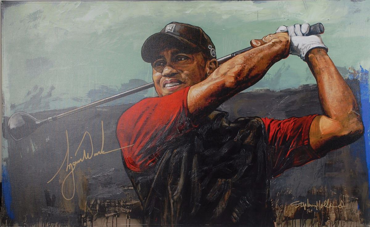 Striking color limited edition 44 x 28 giclee print on stretched canvas entitled ‘Tiger Tee Off,’ numbered 7/69, signed on the left side in gold felt tip by Woods. Also signed in gold felt tip by the artist, Stephen Holland. In fine condition.
