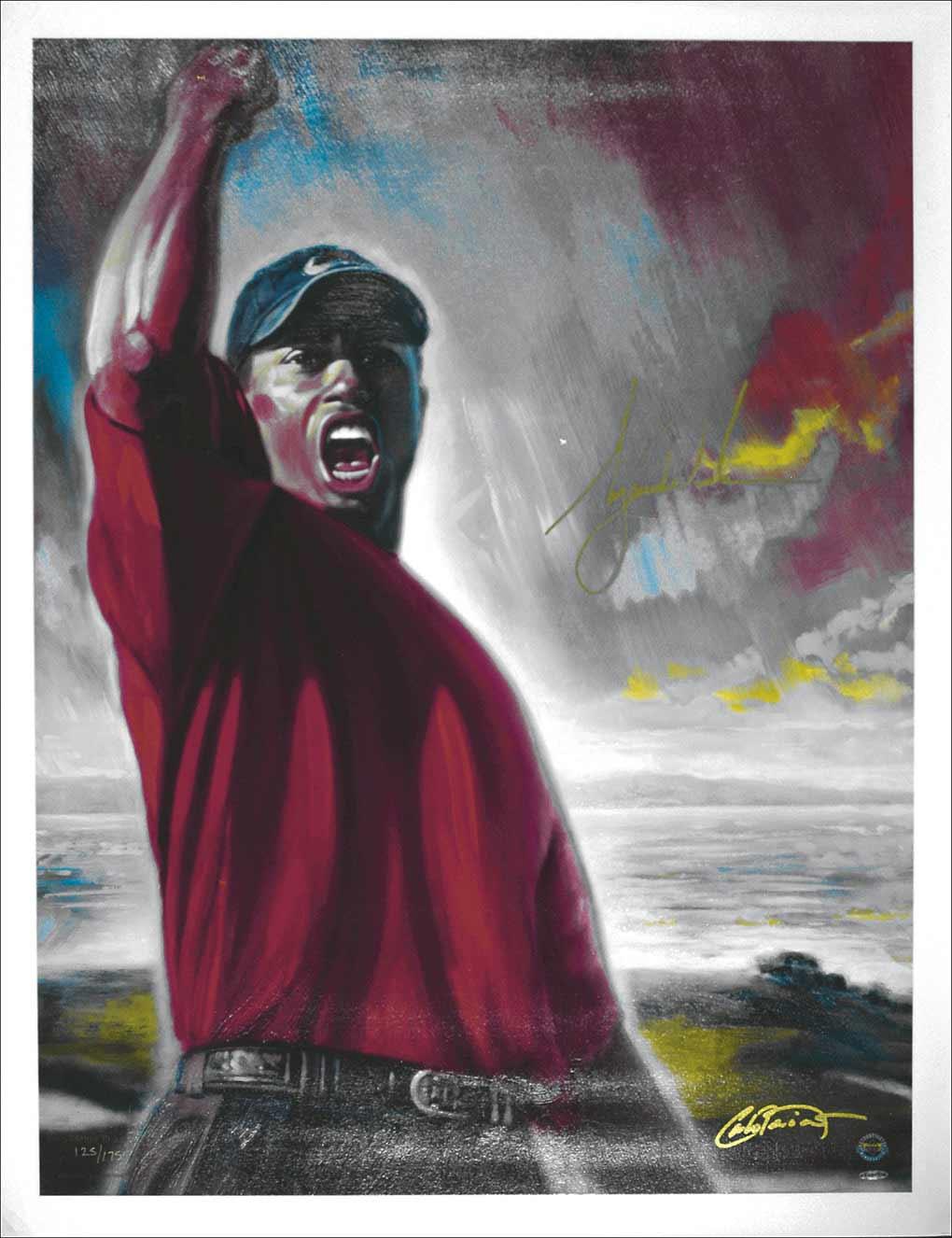 Stunning limited edition color 30 x 40 giclee print on canvas entitled Tiger Roars, depicting Woods pumping his fist in the air, #125/175, signed in gold ink by Woods. Also signed in gold ink by the artist Carlos Beninati. Accompanied by a certificate of authenticity from Upper Deck. Rolled and in very fine condition, with an Upper Deck hologram affixed to lower right corner. A visually stunning piece with an absolutely gigantic signature.