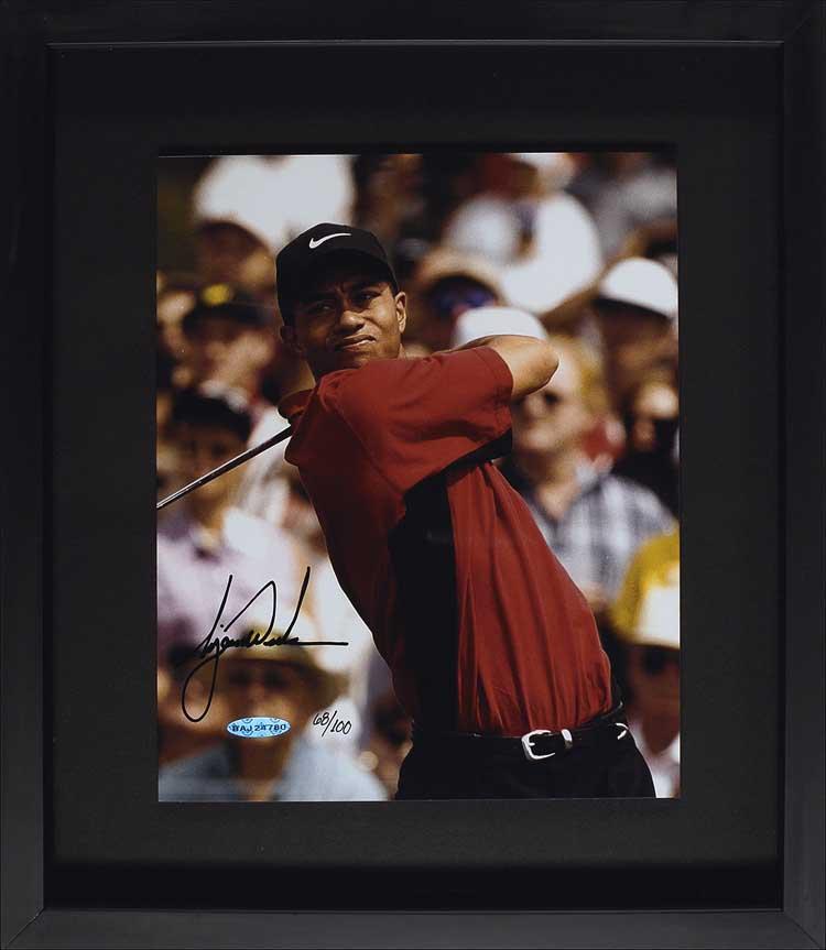 Limited edition color satin-finish 8 x 10 Major Moments photo of Woods driving during the 1997 Masters, numbered 78/100, signed on the photo in black felt tip. Float matted and framed to an overall size of 13.25 x 15.25. Accompanied by a certificate of authenticity from Upper Deck. In very fine condition. Pre-certified Steve Grad/PSA/DNA and RRAuction COA.
