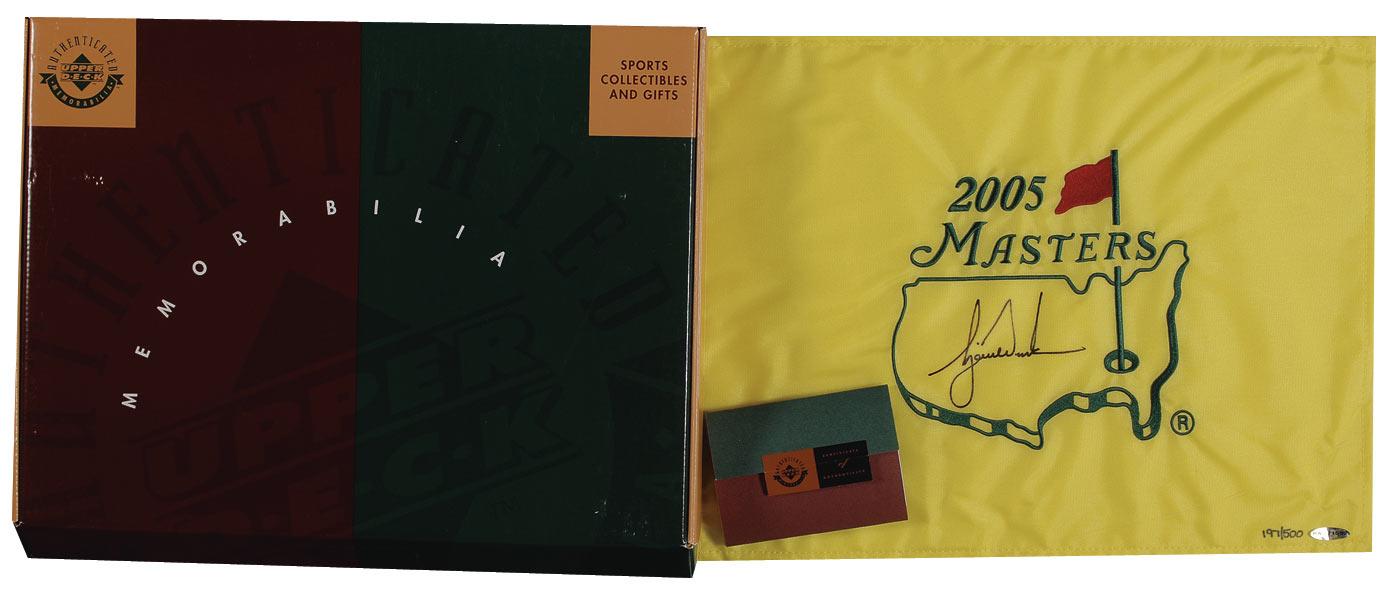 Bright yellow 2005 Masters golf flag signed in black felt tip on the front. Accompanied by a certificate of authenticity from Upper Deck as well as its original Upper Deck box. In very fine condition. Pre-certified Steve Grad/PSA/DNA and RRAuction COA.