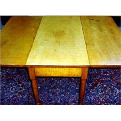 Tiger maple drop-leaf table. One board top and drops. Turned and tapered legs. 28" h X 55" w X 39" d $450-650